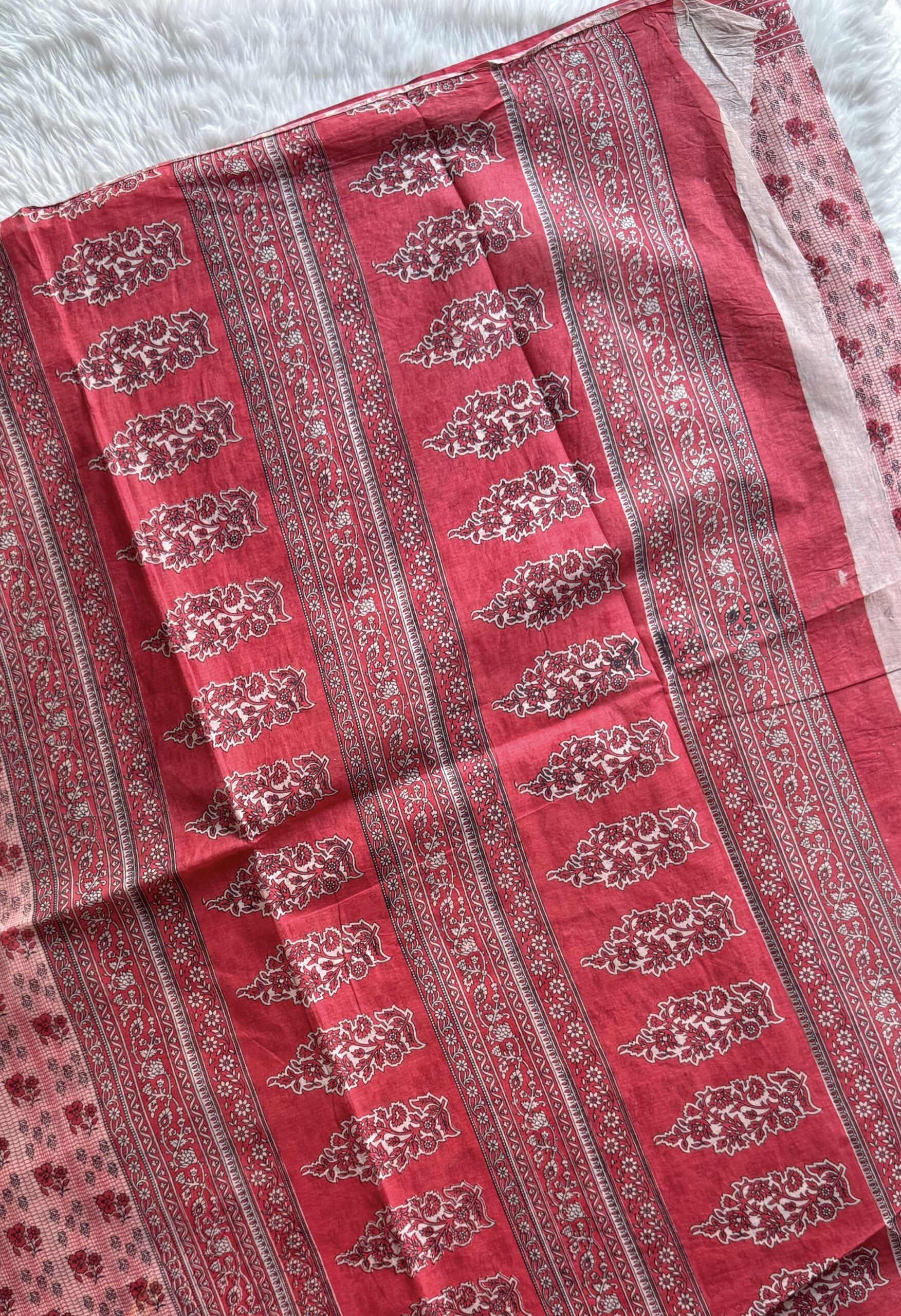 A lightweight, reasonably priced cotton saree with blouse, pallu, and border motifs printed with flowers.
