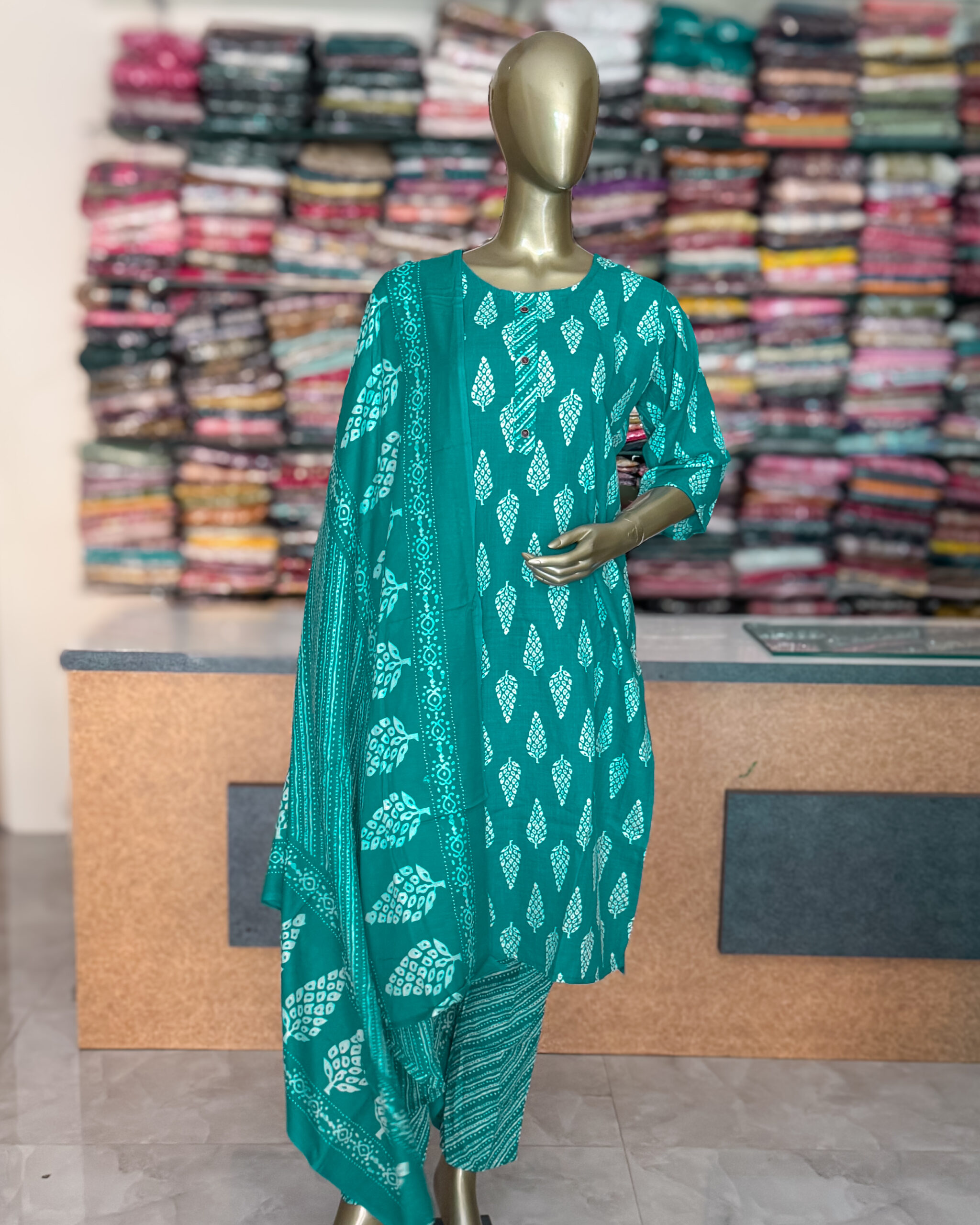 Shop affordable cotton salwar suit for women featuring round neck, decorative button yoke, printed dupatta, and elastic pants. Soft, comfortable, and perfect for daily wear.