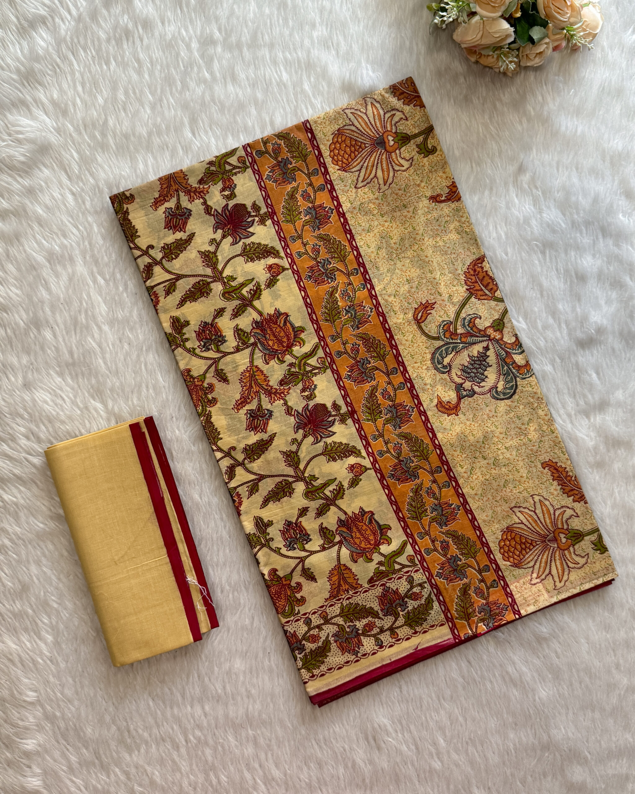 A lightweight, reasonably priced cotton saree with blouse, pallu, and border motifs printed with flowers.