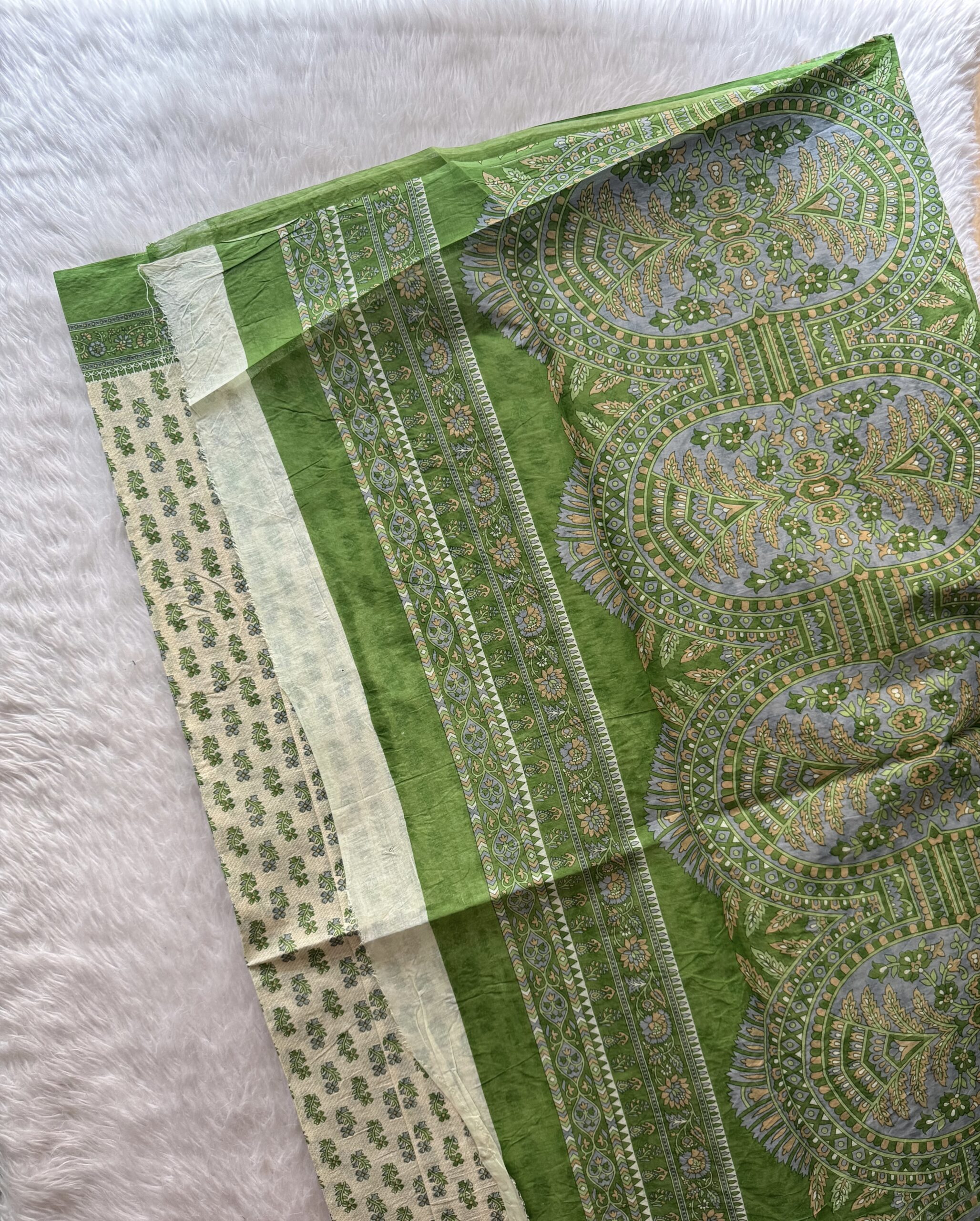 A lightweight, reasonably priced cotton saree with blouse, pallu, and border motifs printed with flowers.