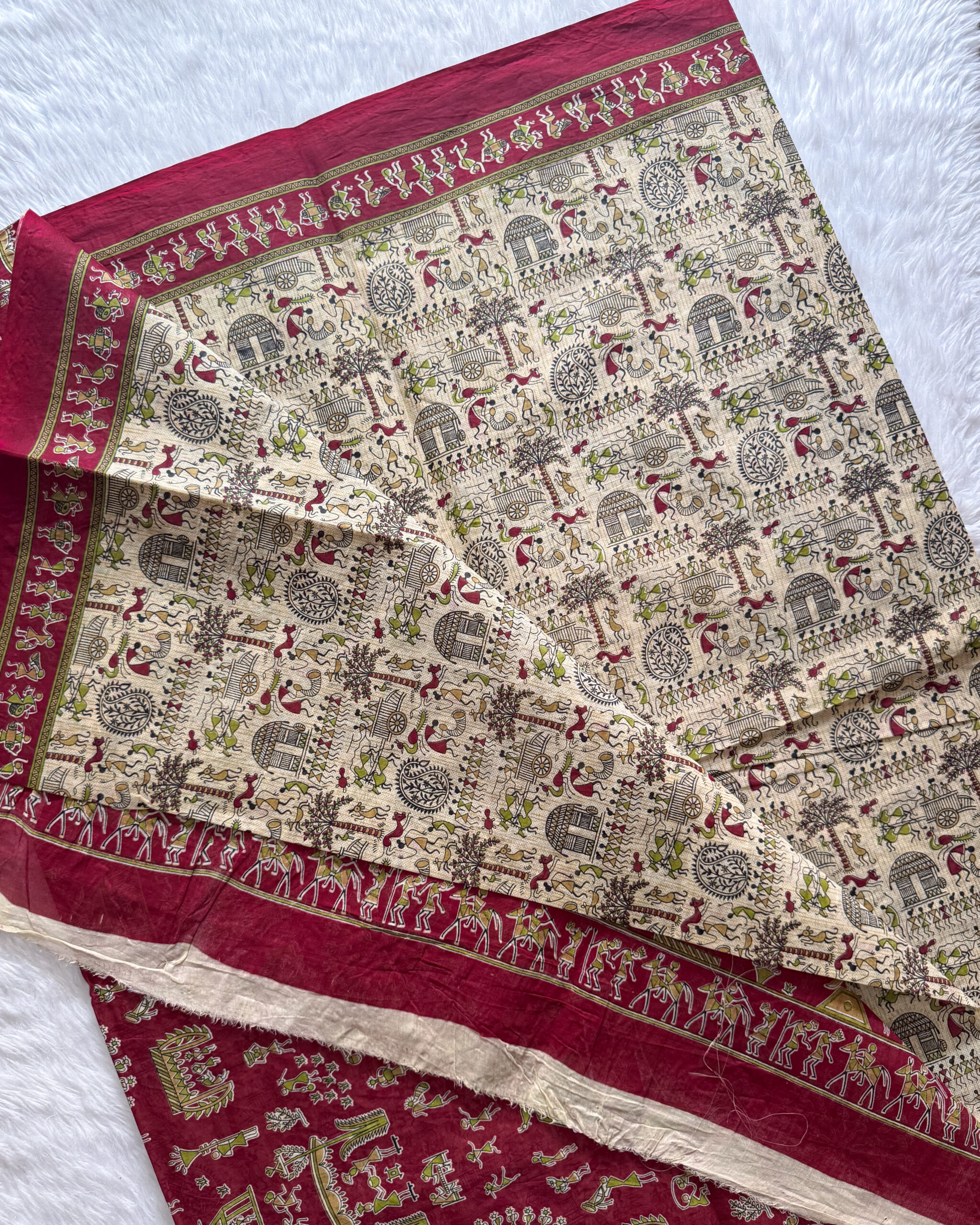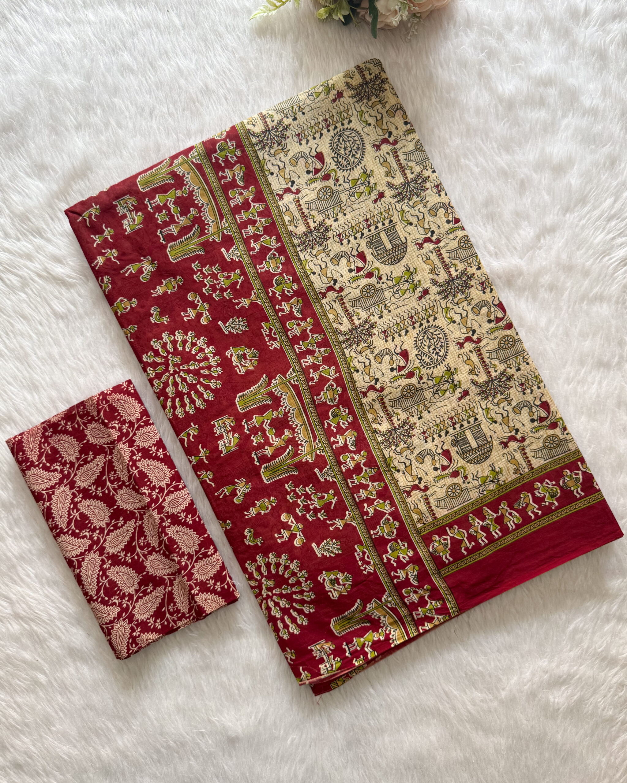 A lightweight, reasonably priced cotton saree with blouse, pallu, and border motifs printed with flowers.