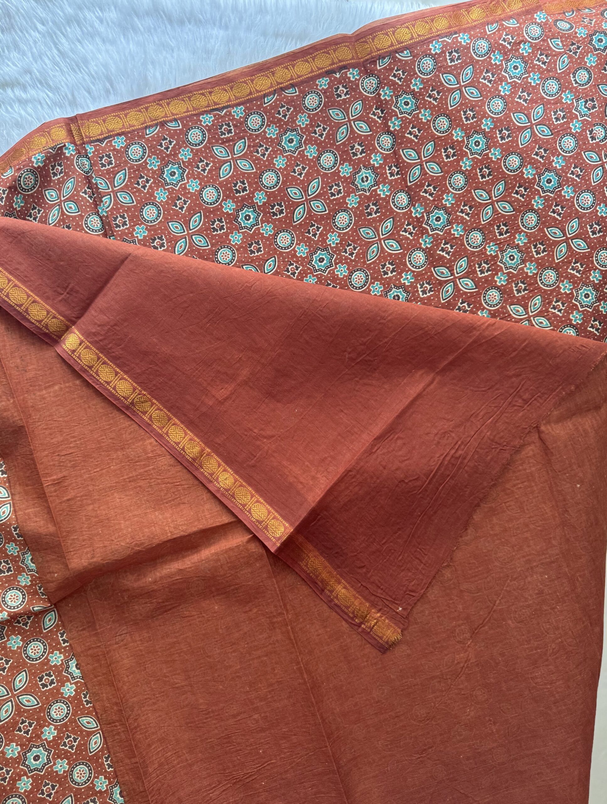 A lightweight, reasonably priced cotton saree with blouse, pallu, and border motifs printed with flowers.