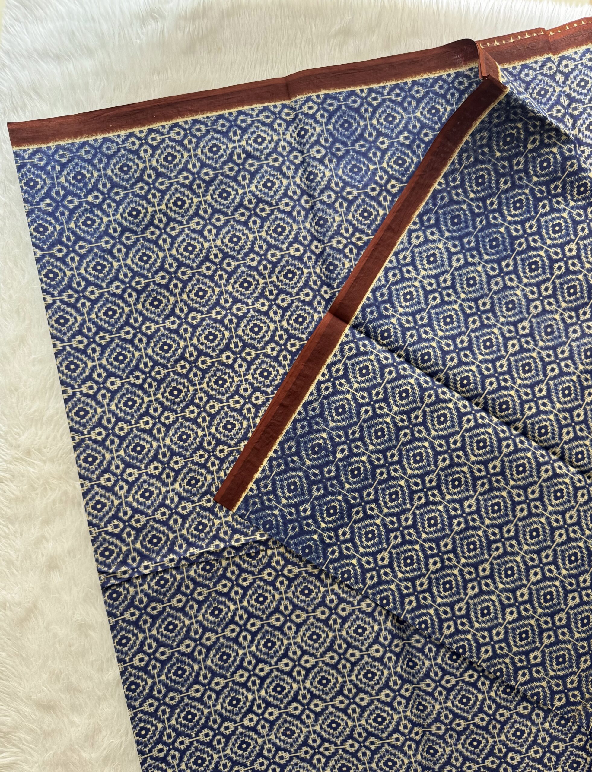 A lightweight, reasonably priced cotton saree with blouse, pallu, and border motifs printed with flowers.