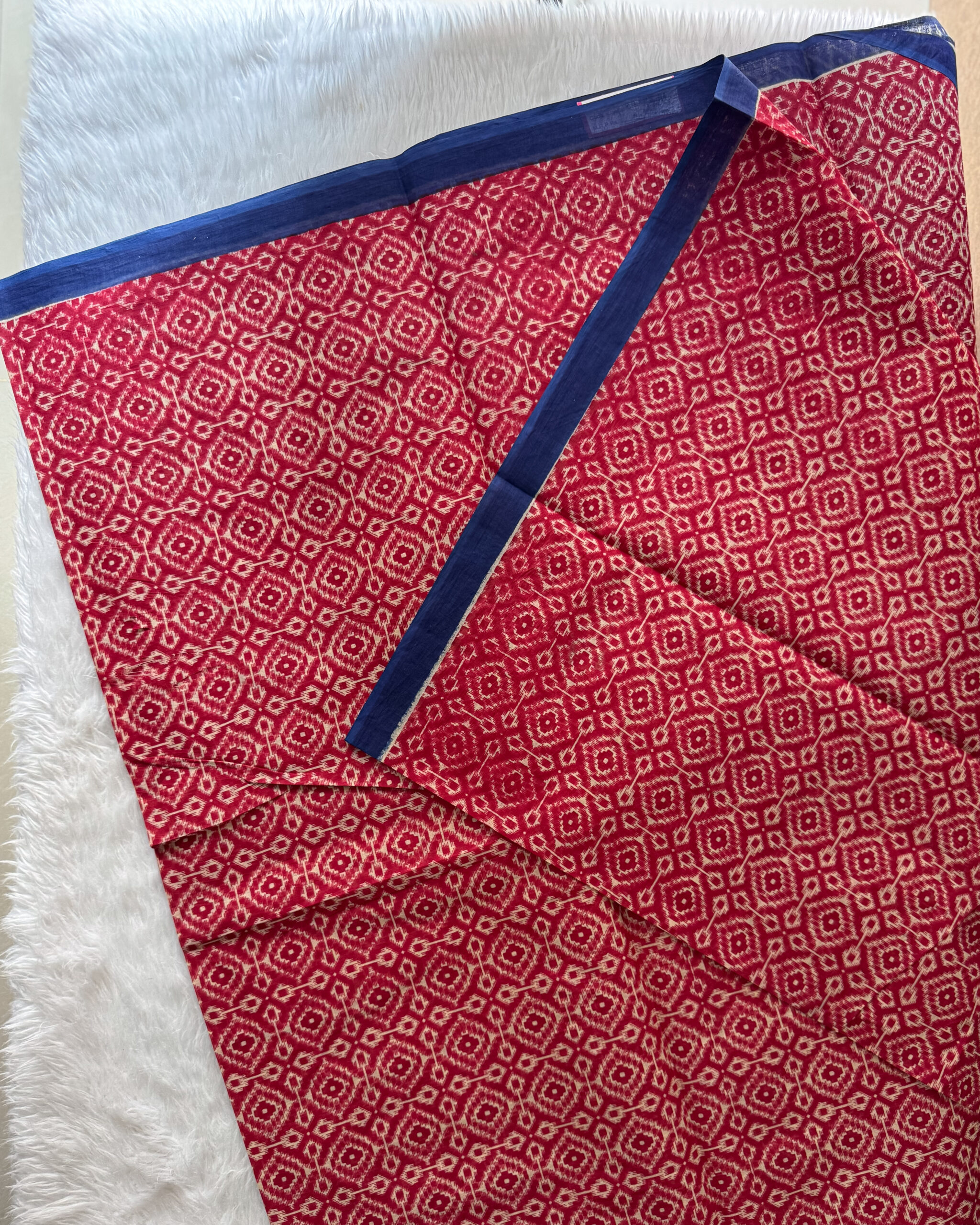 A lightweight, reasonably priced cotton saree with blouse, pallu, and border motifs printed with flowers.