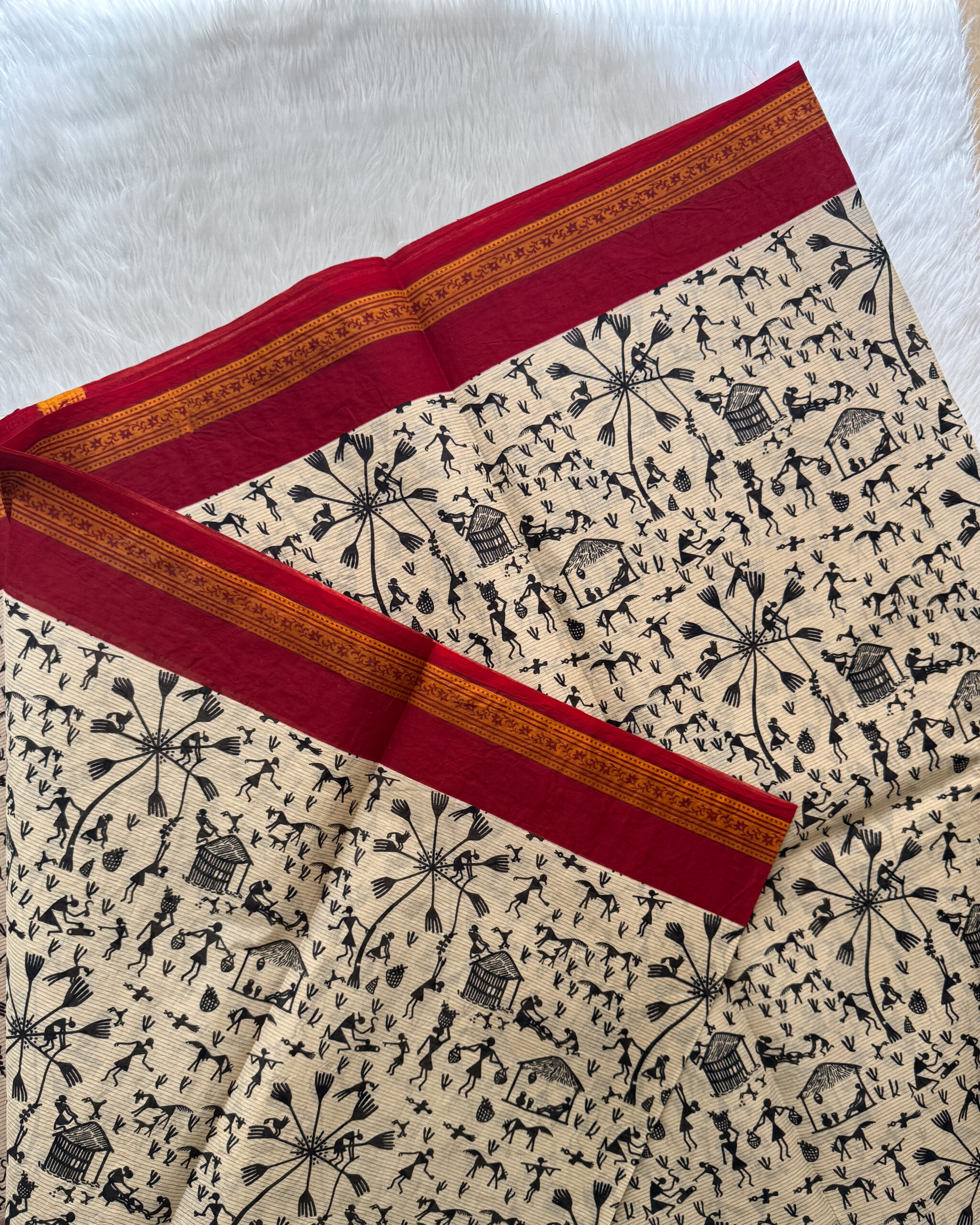 A lightweight, reasonably priced cotton saree with blouse, pallu, and border motifs printed with flowers.