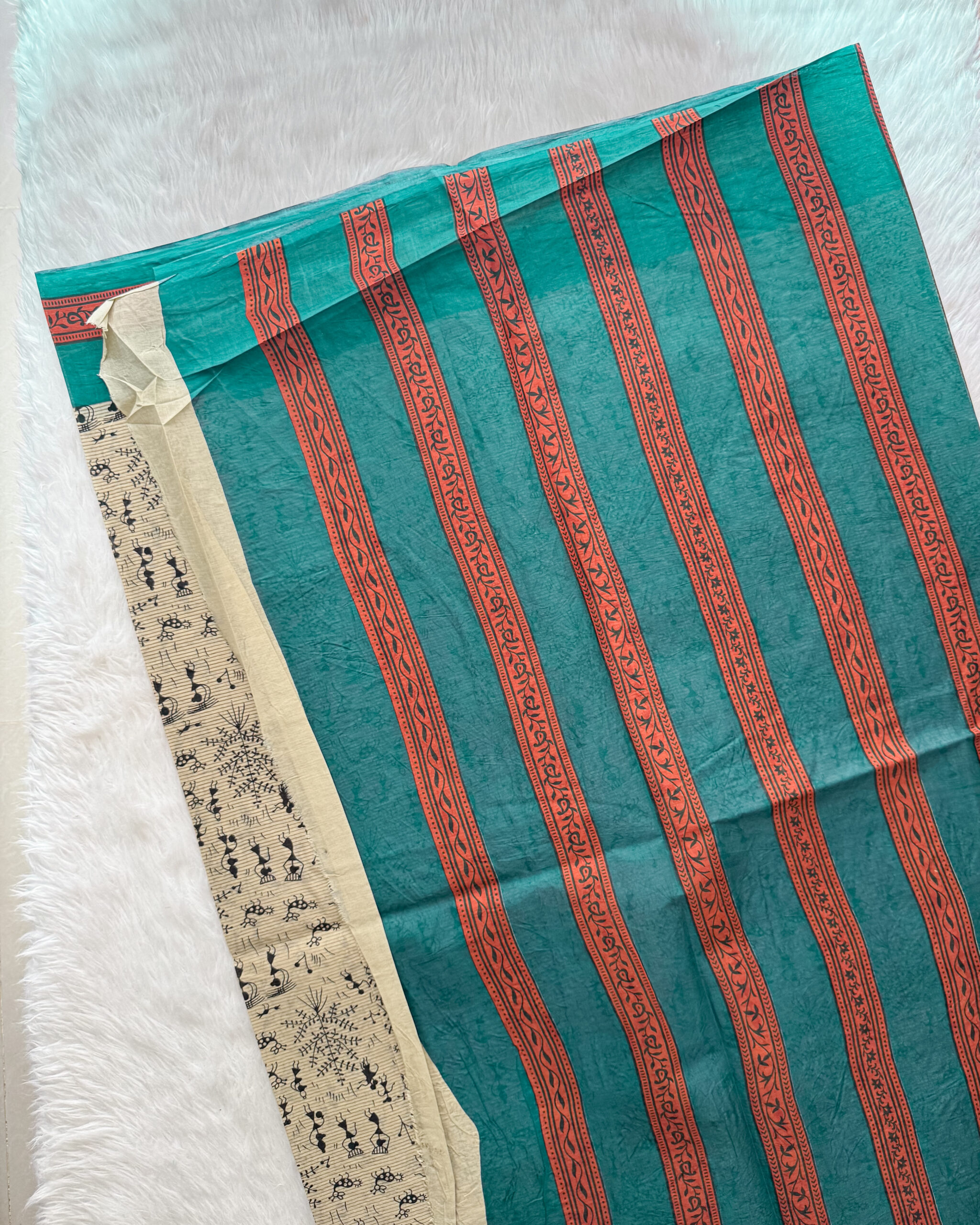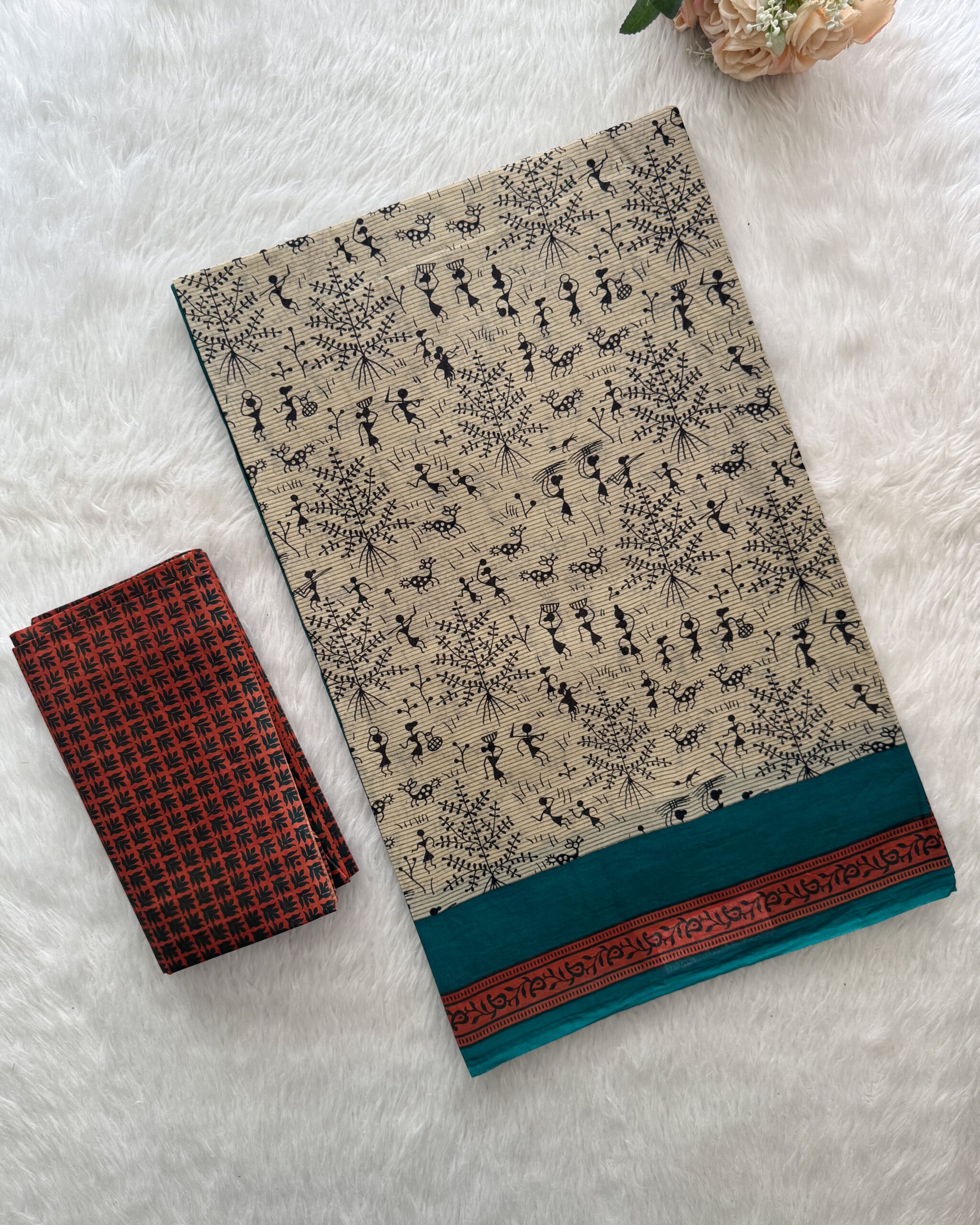 A lightweight, reasonably priced cotton saree with blouse, pallu, and border motifs printed with flowers.