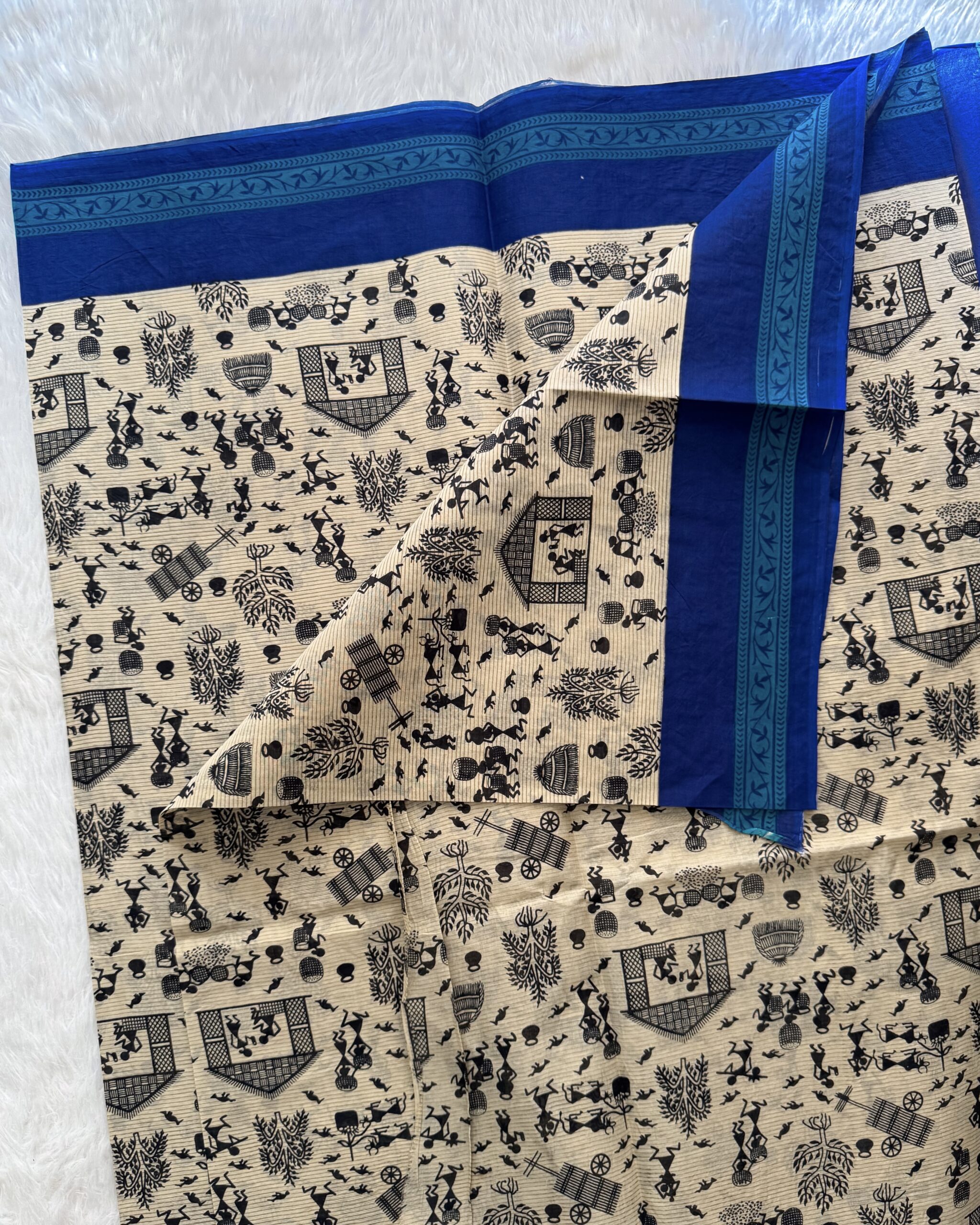 A lightweight, reasonably priced cotton saree with blouse, pallu, and border motifs printed with flowers.