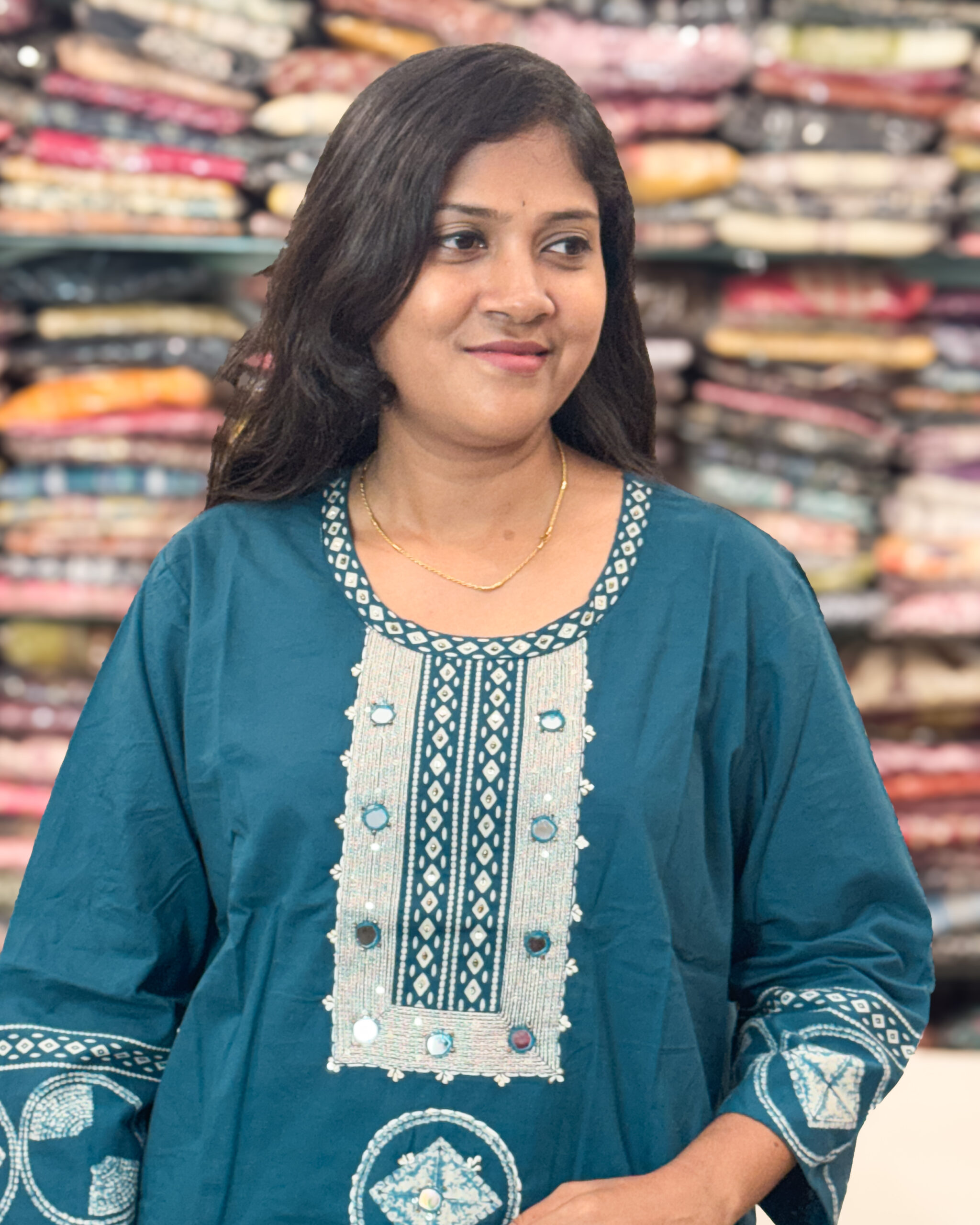 Enhance your ethnic collection with this beautifully crafted cotton salwar suit, designed to offer both elegance and everyday comfort. The kurta features a flattering round neckline that enhances the overall silhouette, while intricate sequin, mirror, and bead work adds a festive and eye-catching touch. The detailed craftsmanship brings a refined and stylish appeal suitable for both casual and special occasions.