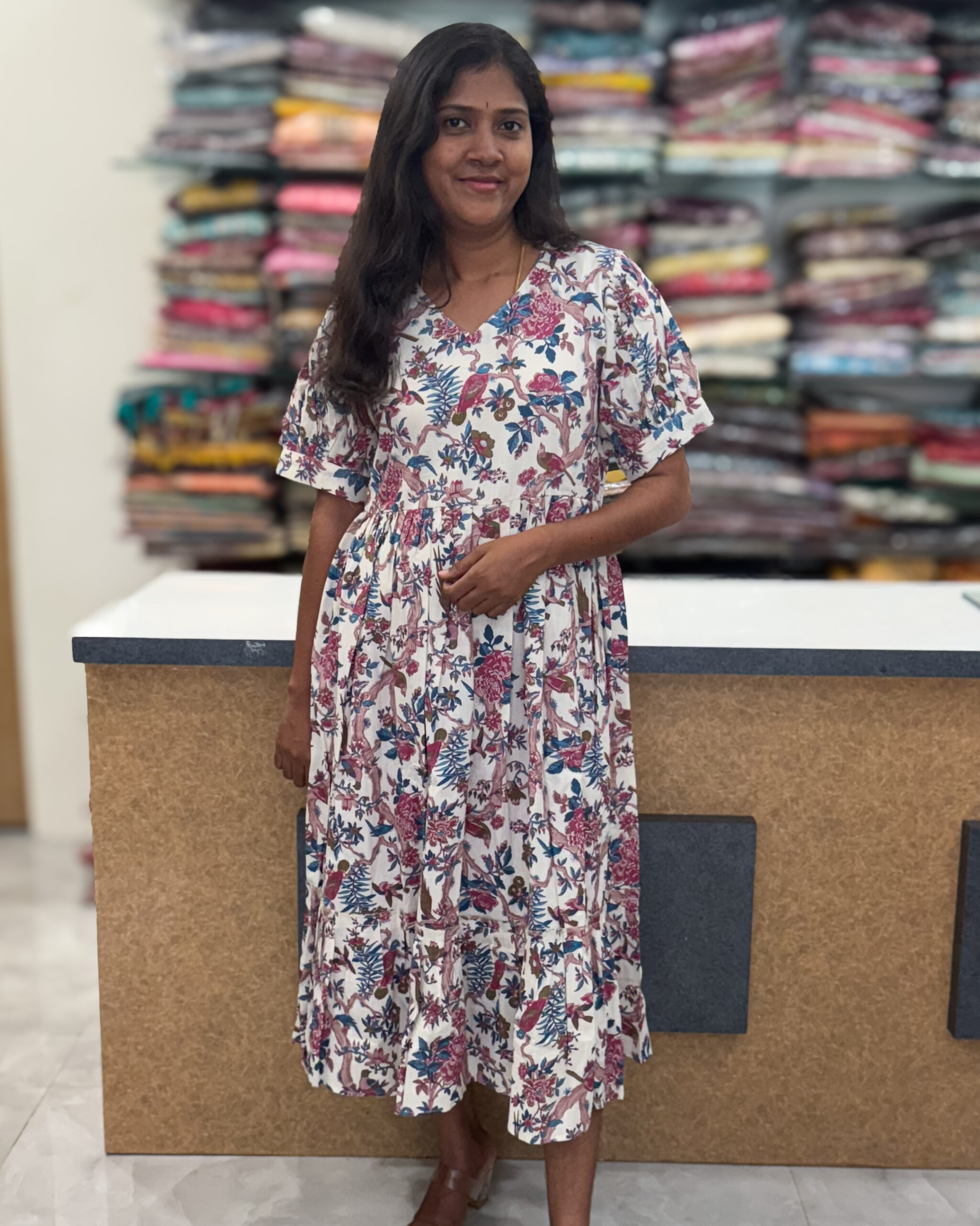 The V-neck is a feature of the cotton dress. It is beautifully printed. contains a single packet attached to the gown. comes with puffy sleeves. It goes well with ethnic clothing, business wear, and daily wear.