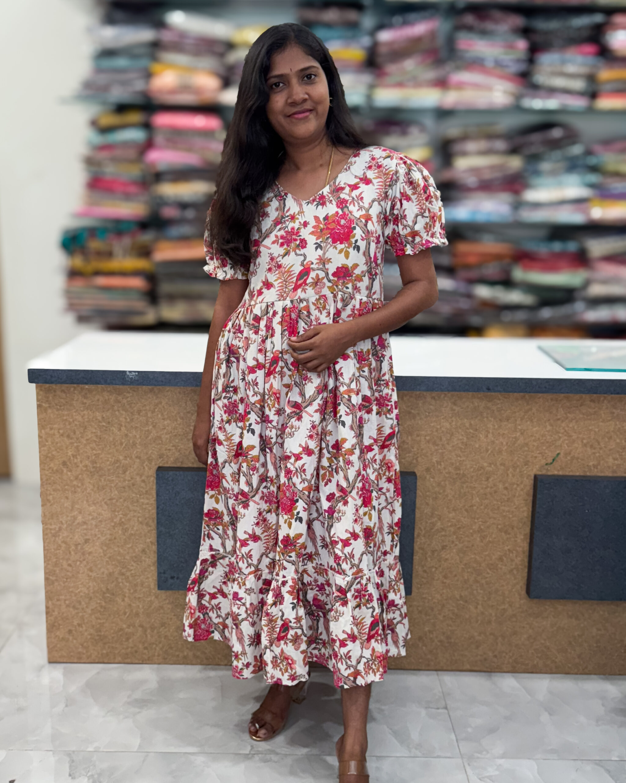 The V-neck is a feature of the cotton dress. It is beautifully printed. contains a single packet attached to the gown. comes with puffy sleeves. It goes well with ethnic clothing, business wear, and daily wear.
