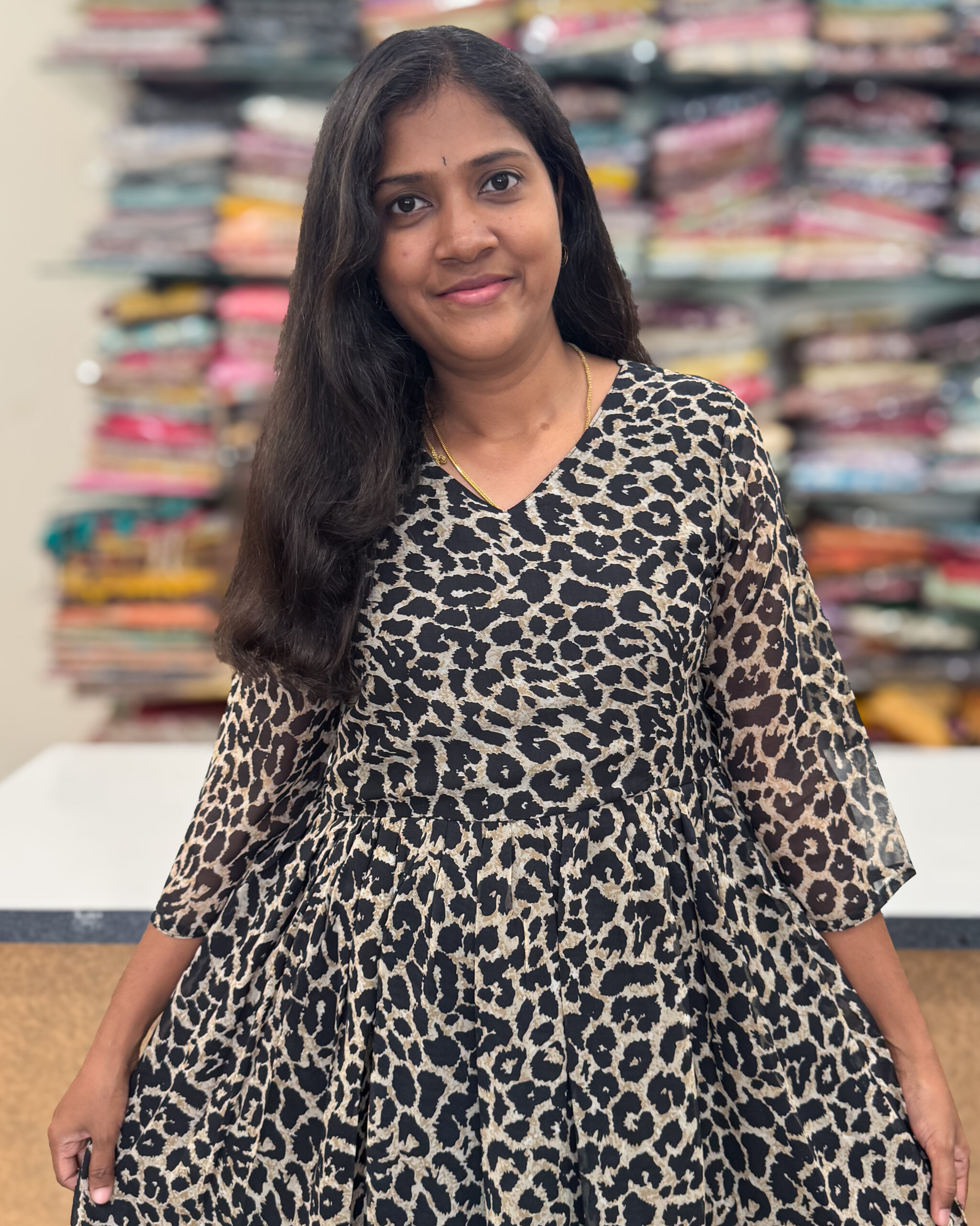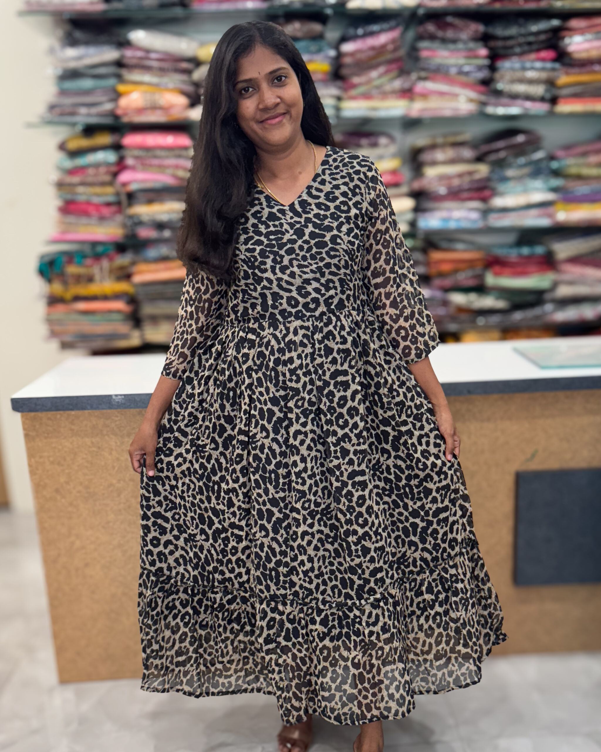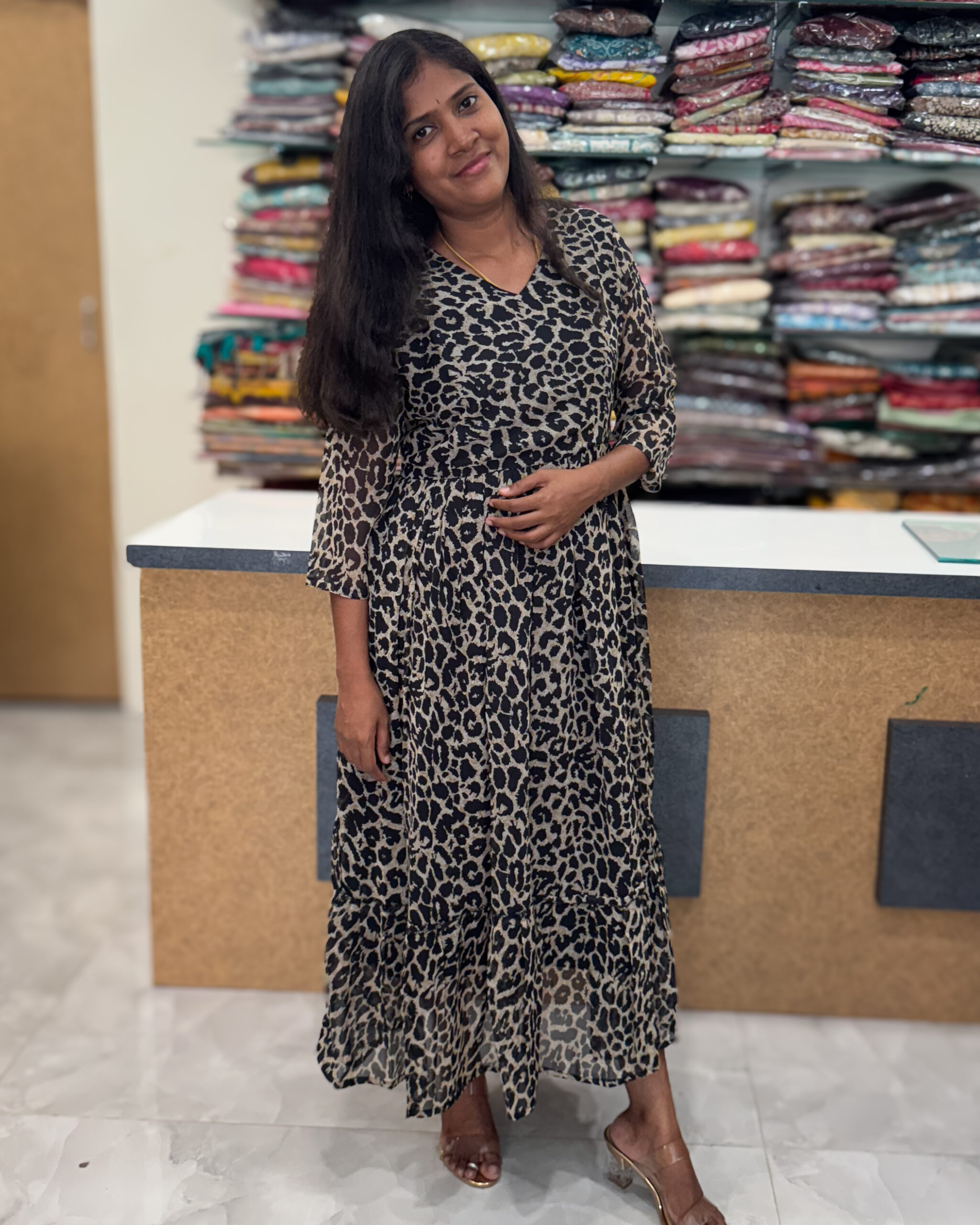 This lovely georgette dress features 3/4 sleeves with floral patterns and a V-neck. The crepe lining guarantees optimal comfort, while the charming flower print adds a touch of charm and delicacy.