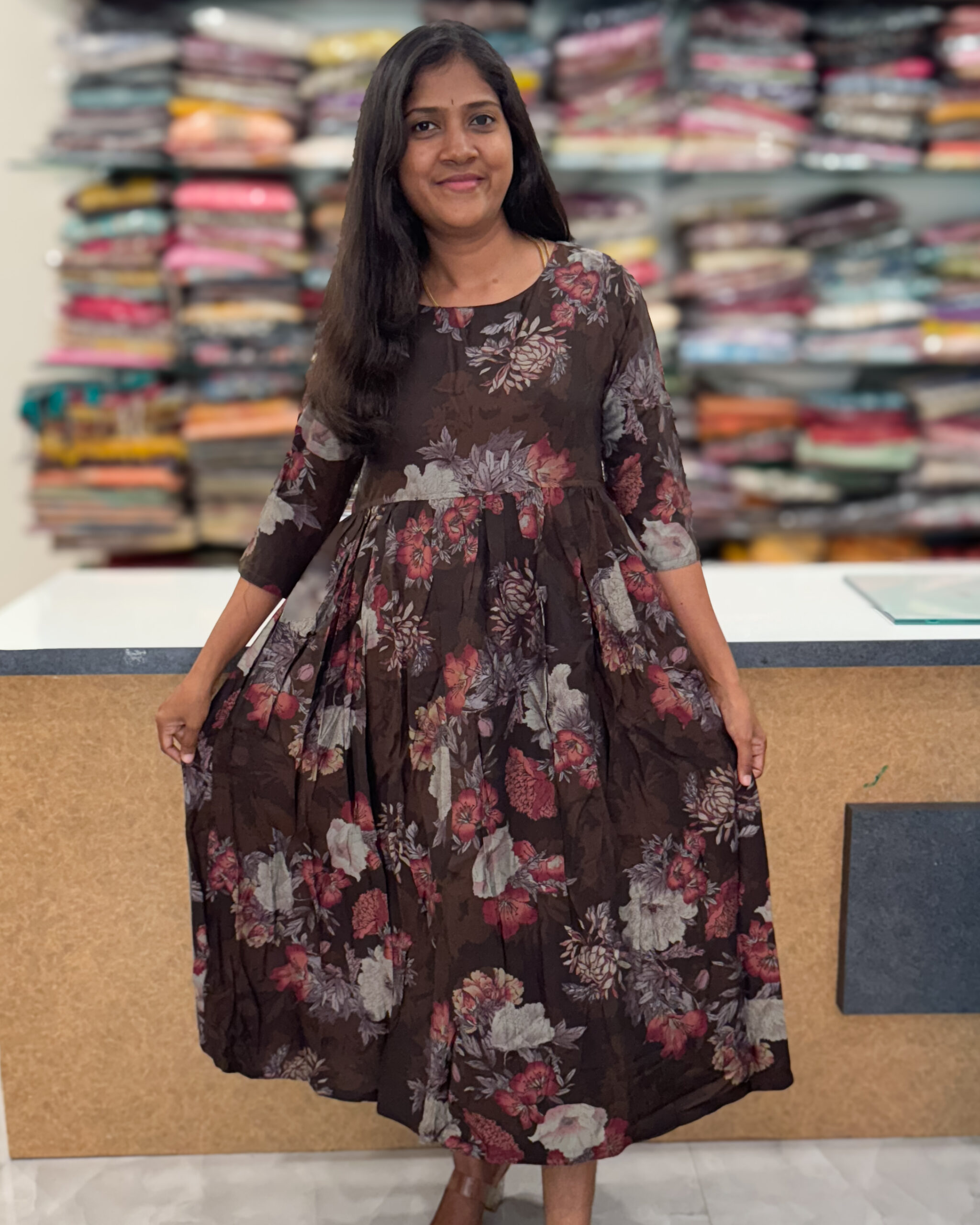 The dress made of muslin has a round neck. It’s attached to the 3/4 sleeves. It complements ethnic clothing, office wear, and everyday wear nicely.
