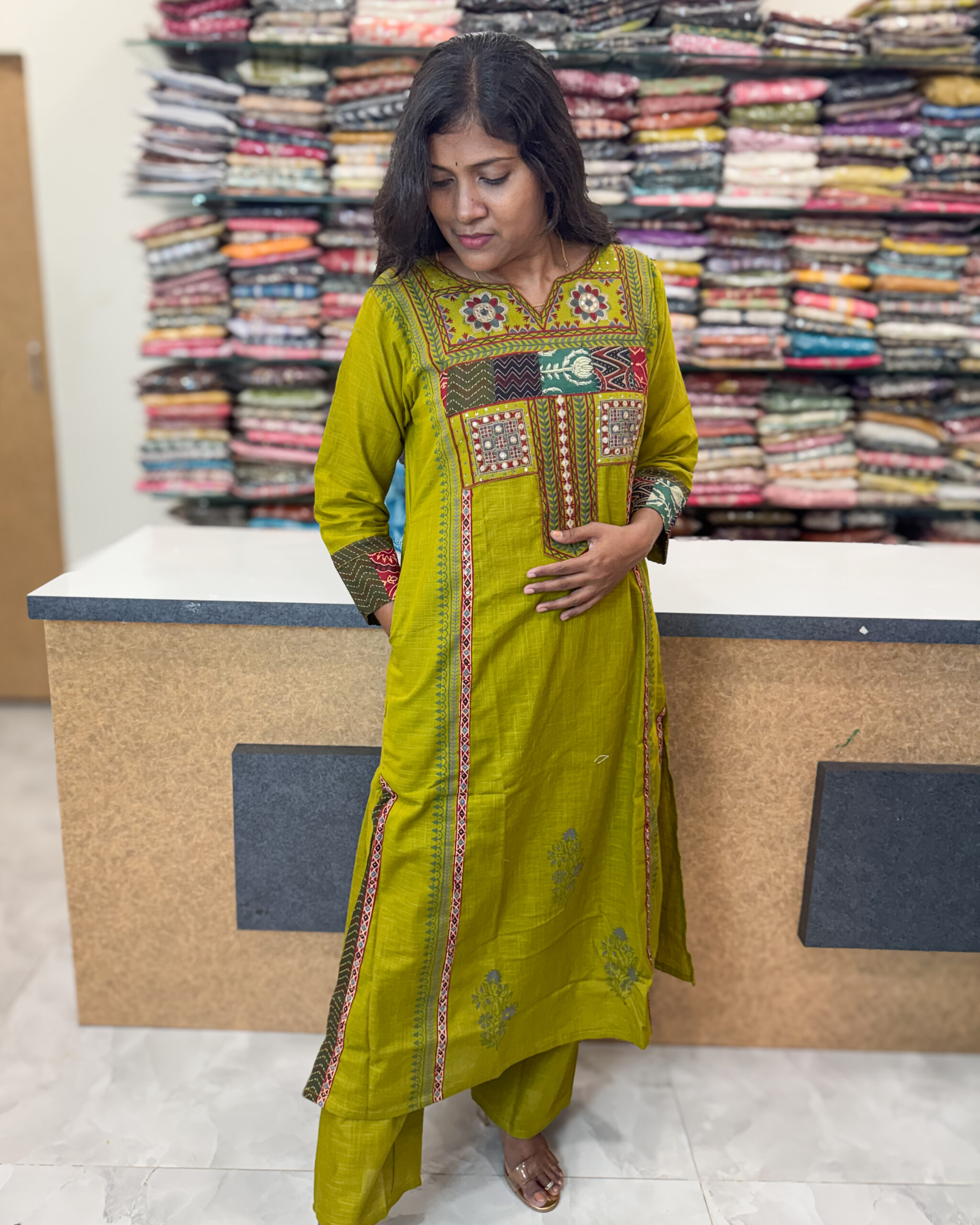 Enhance your ethnic wardrobe with this lovely A-line salwar suit, featuring vibrant handblock prints and intricate colorful embroidery highlighted with sequins work. Designed with a stylish slit for a modern ethnic appeal, this outfit is paired with comfortable straight pants for ease of movement. The look is beautifully completed with a soft tie-dye printed dupatta, adding a graceful finish. Ideal for festive occasions, casual gatherings, and celebrations, this outfit offers the perfect blend of tradition and contemporary style.