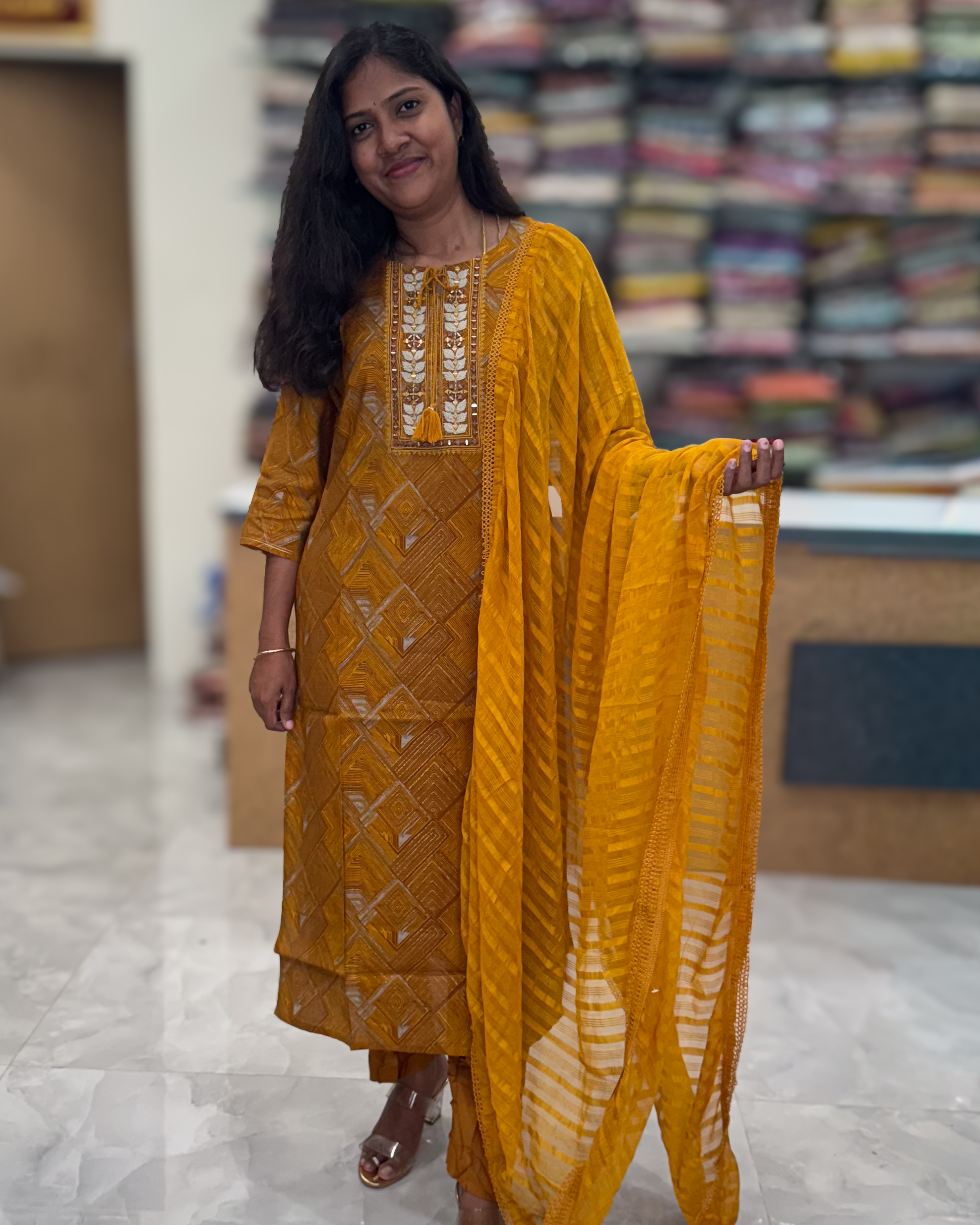 This lovely set of muslin salwar set features a normal elastic bottom and a round neck with keywhole knot , embroidery mirror works in the yoke pattern. It comes with elastic regular pant and synthetic lace work duppata.