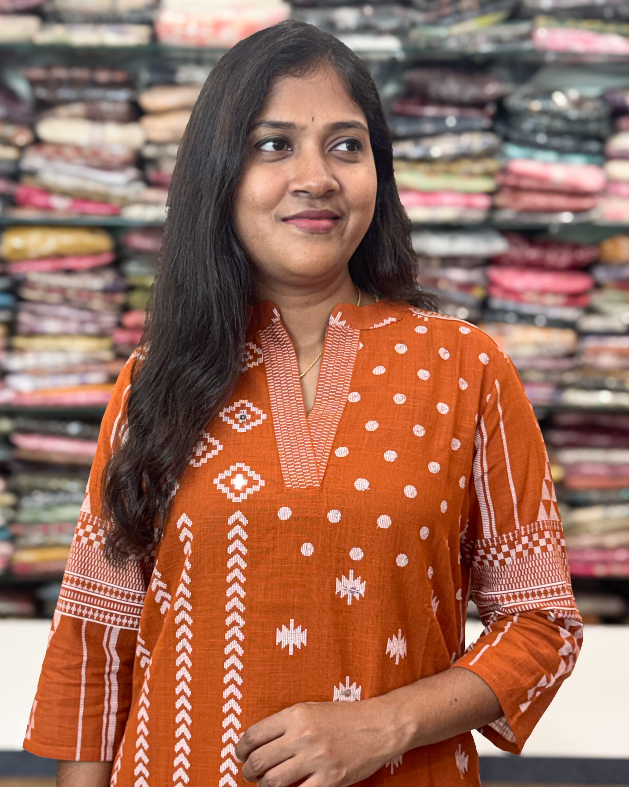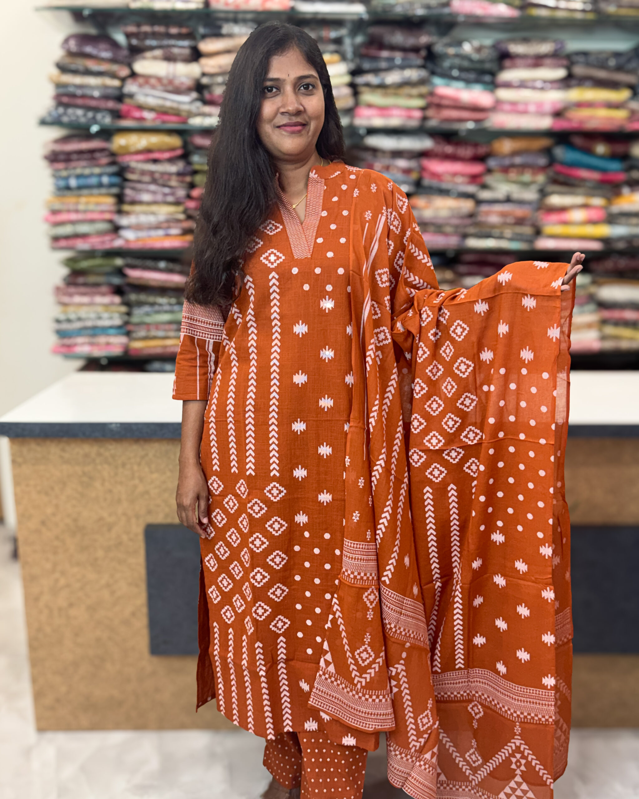Printed cotton salwar suit with dupatta featuring collar neck, sequins highlights and elastic pants with both side pockets.