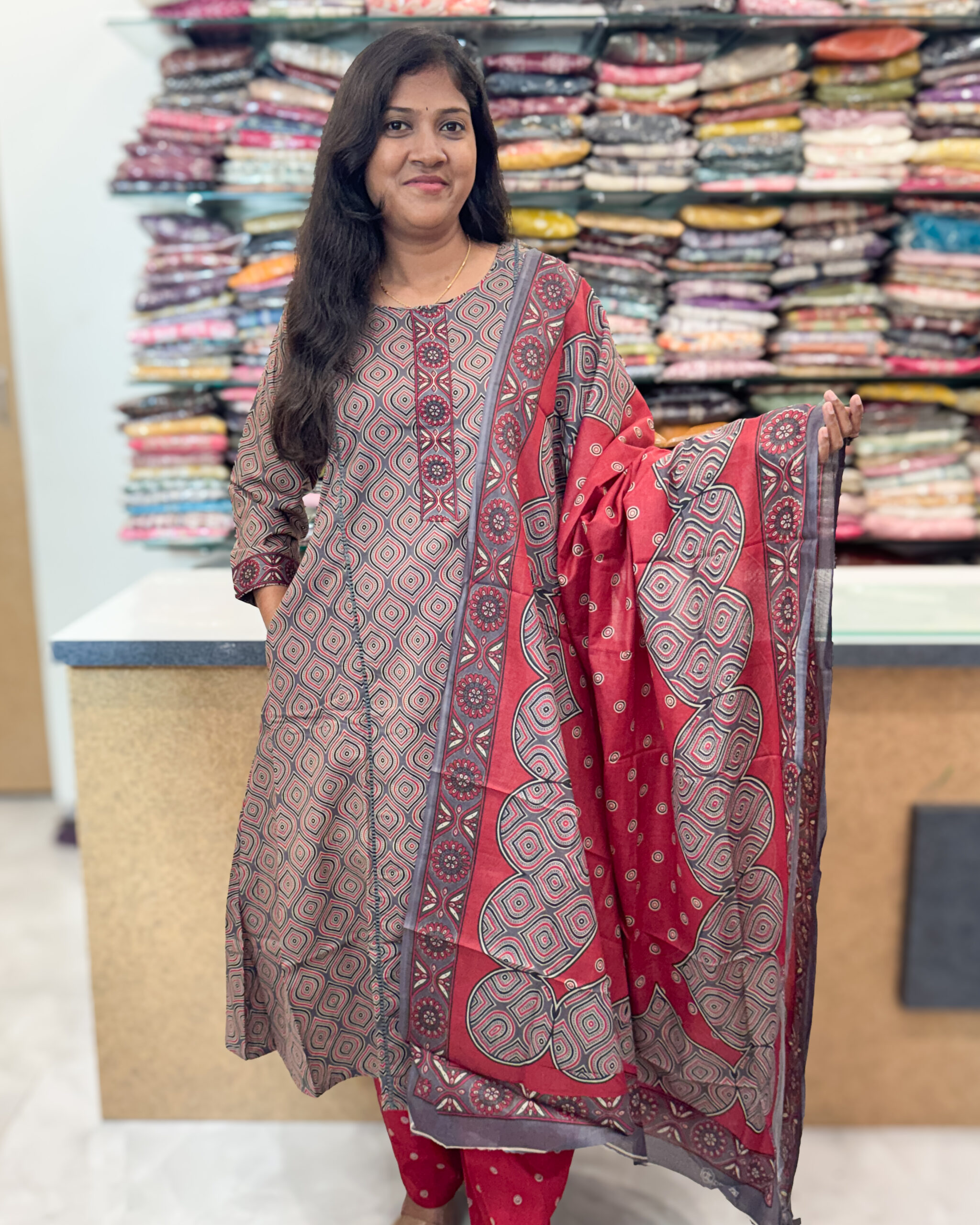 This salwar suit with dupatta comes with elastic pants designed for ease of movement and all-day comfort. The adjustable knot waist ensures a better fit, while the partial pocket adds practical convenience. A matching cotton printed dupatta completes the ensemble, bringing balance and traditional appeal to the overall look. Made from breathable cotton fabric, this outfit is ideal for office wear, shopping trips, casual outings, and daily wear. Stylish, lightweight, and versatile, this salwar suit with dupatta is a must-have addition to your wardrobe.