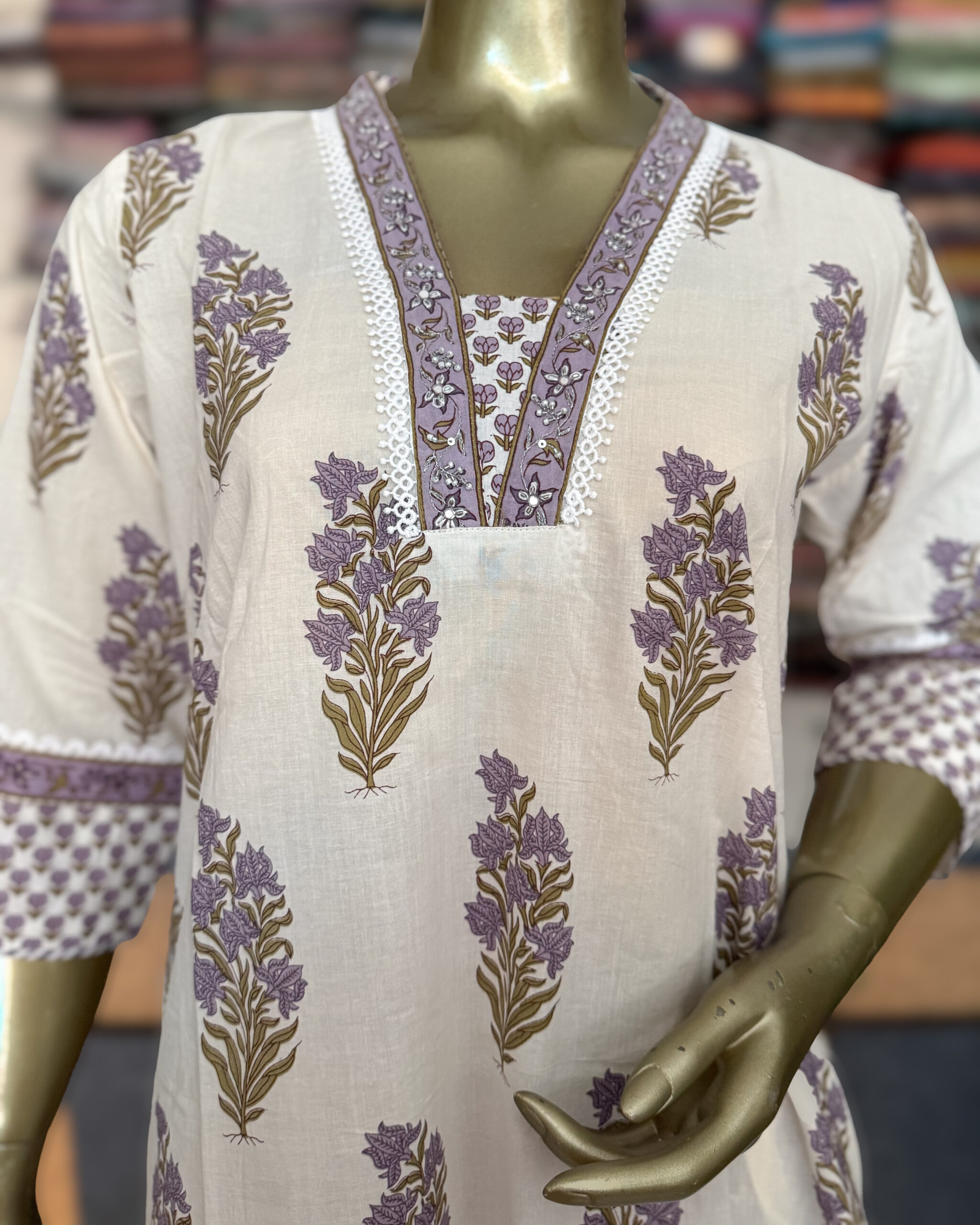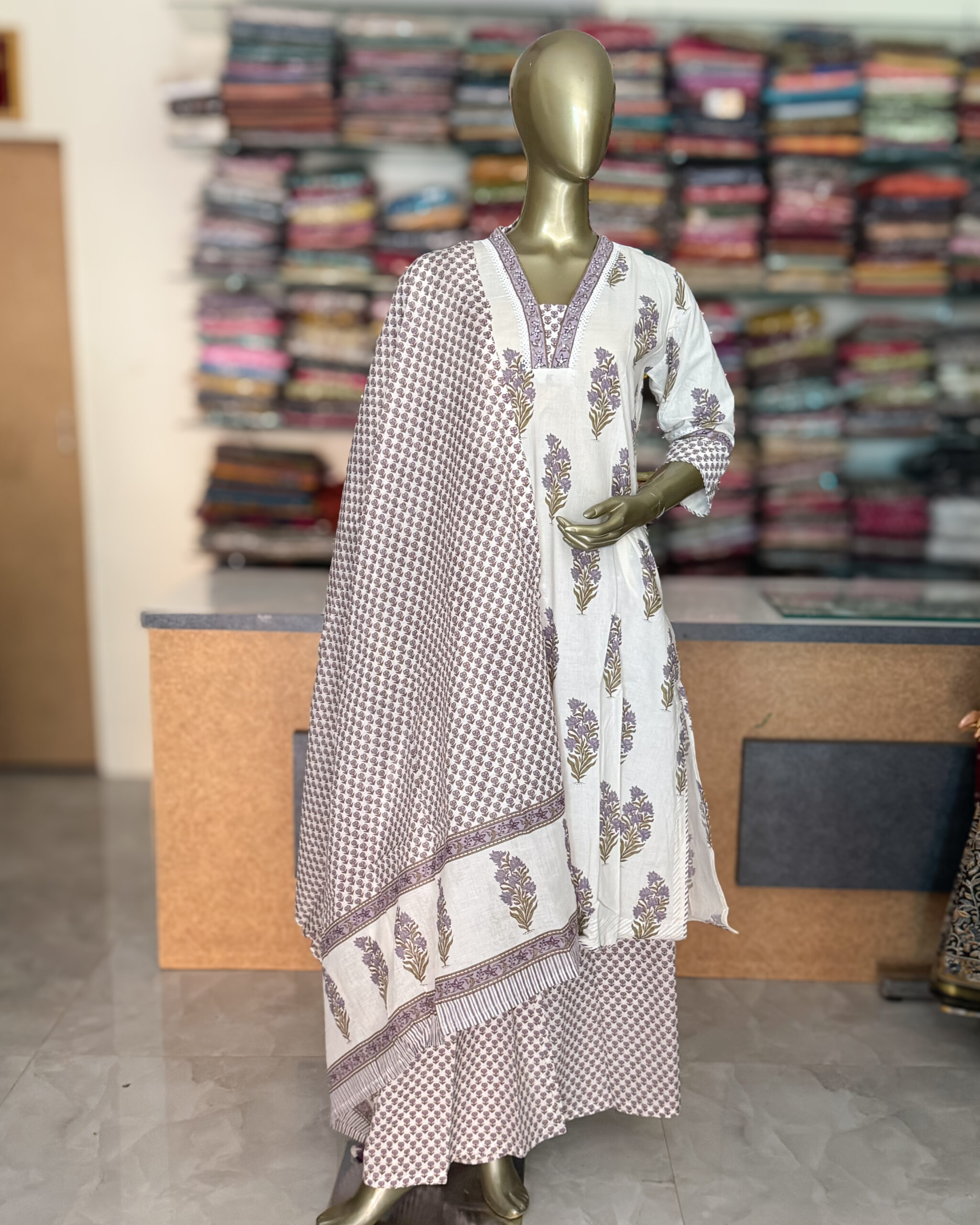 This gorgeous salwar set, which includes a collar neckline that is beautifully embellished with lace, sequins, and flowers, is worn with relaxed elastic-waist palazzo pants and a matching printed dupatta for a refined look.