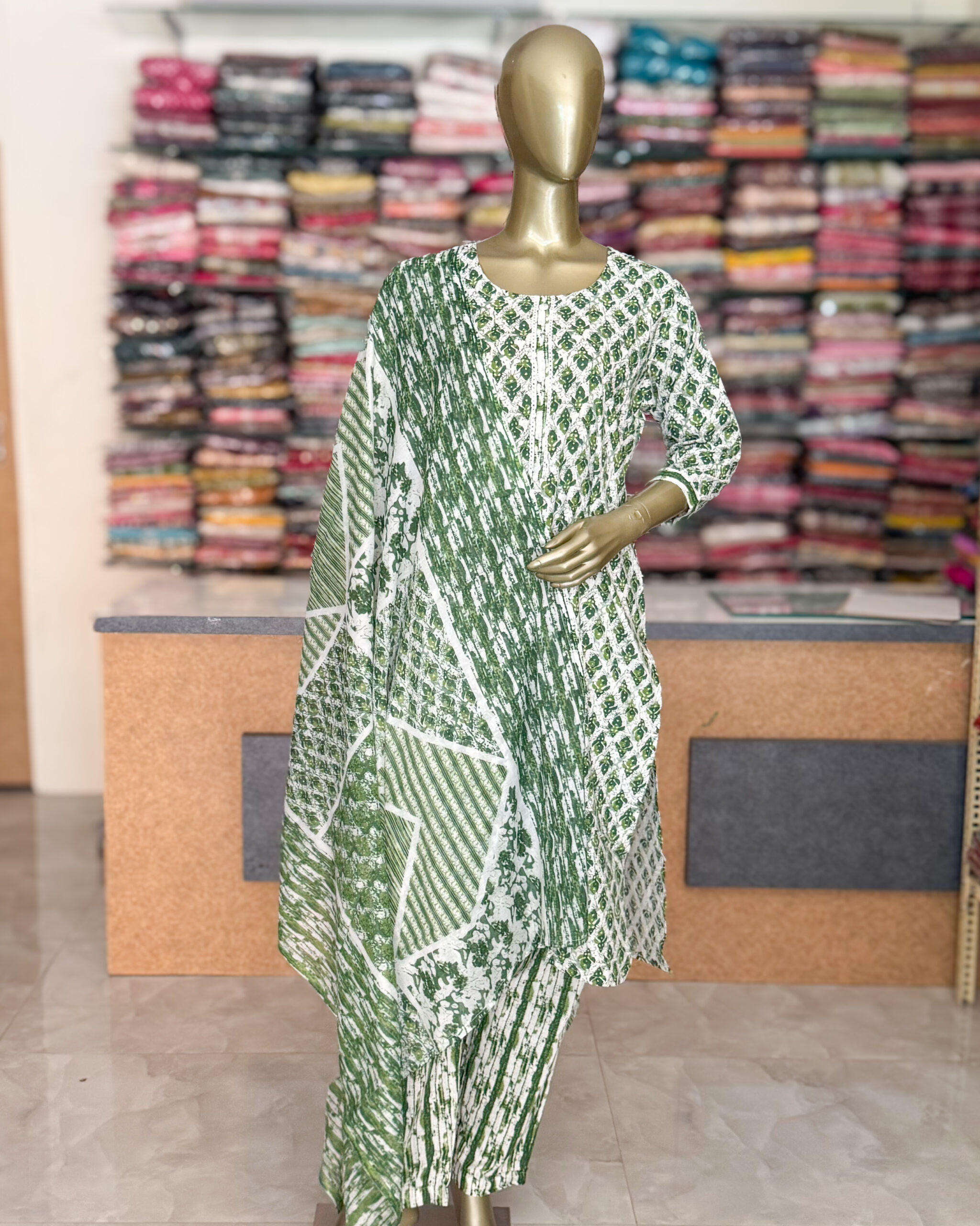 Paired with regular elasticated pants, the set offers a comfortable fit suitable for long hours of wear. The printed dupatta complements the outfit beautifully, adding color and traditional charm. Ideal for office wear, daily routines, casual gatherings, and light festive occasions, this cotton salwar suit pairs well with minimal accessories for a polished ethnic look. A perfect choice for women who value comfort, elegance, and versatility in their everyday ethnic wear.