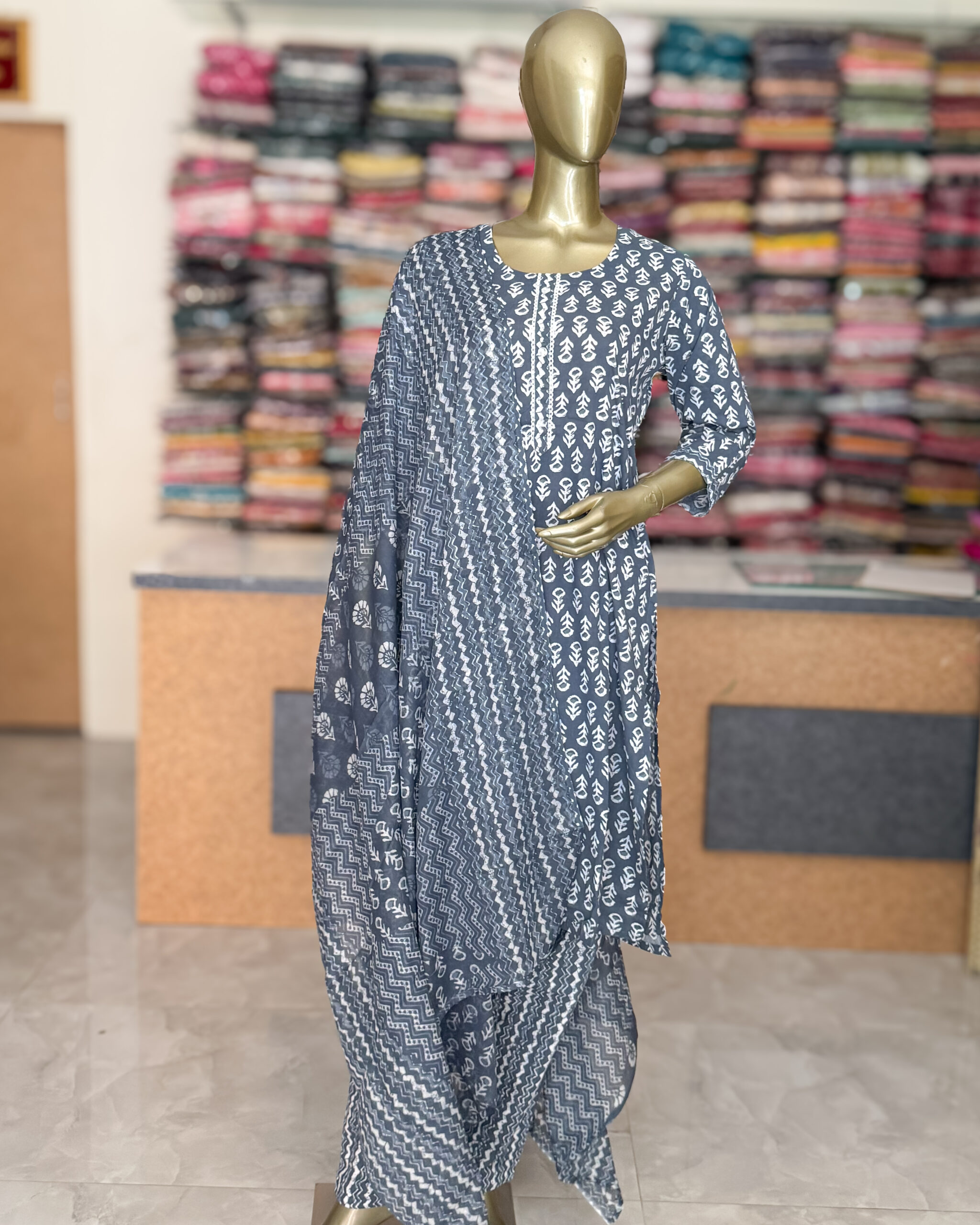 This stylish cotton salwar set features elegant floral prints that add charm to your everyday ethnic look. Designed with a round neckline, it showcases beautifully embroidered yoke detailing enhanced with delicate mirror work. The breathable cotton fabric ensures all-day comfort, while the elasticated pants provide a relaxed fit. A matching printed dupatta completes the set, making it ideal for office wear, casual outings, and festive occasions.
