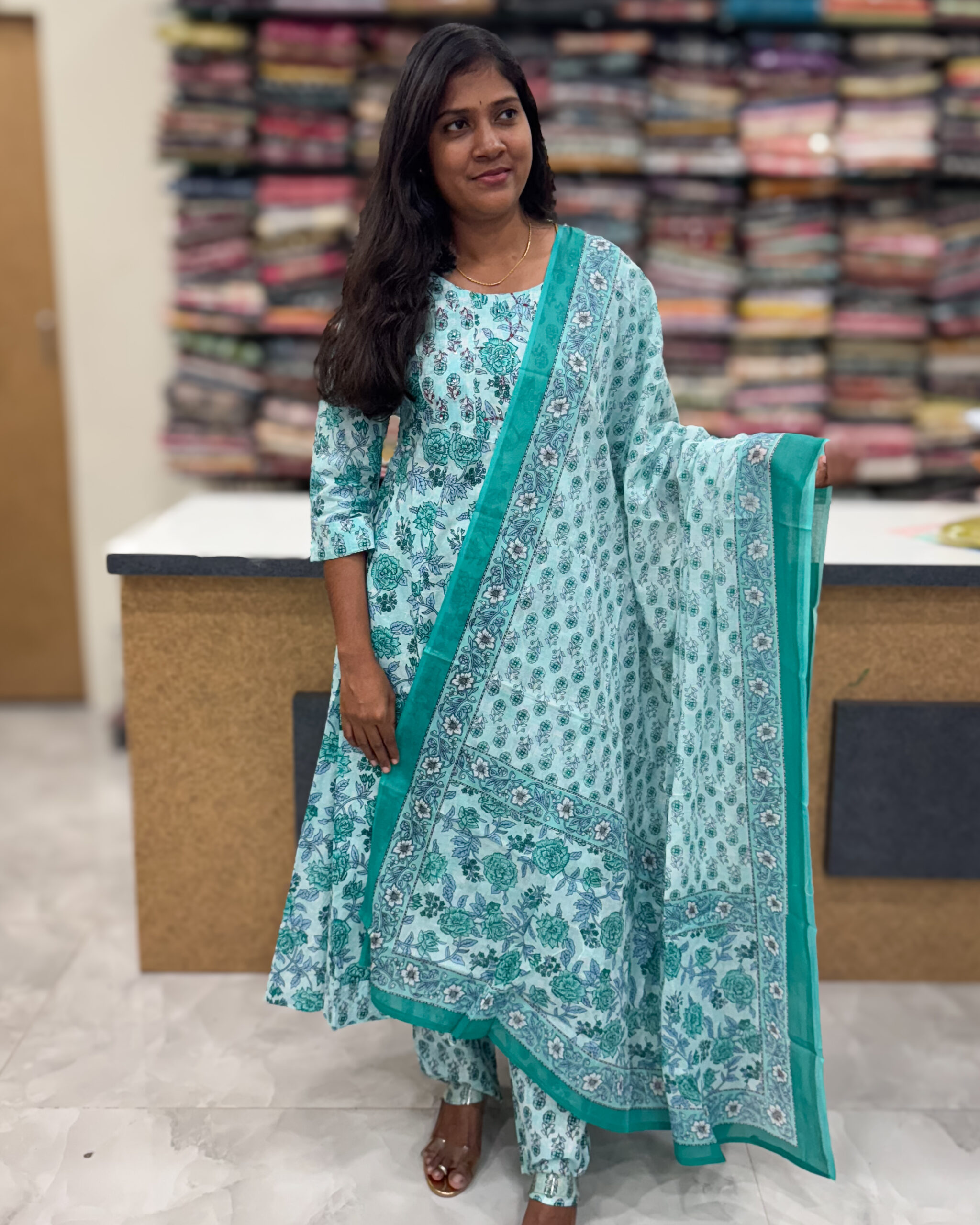 This splendid cotton salwar suit features an elegant curved V-neck adorned with intricate embroidery, sequins, and mirror work, paired with straight stretch-fit pants and a beautifully patterned dupatta for a sophisticated ensemble.