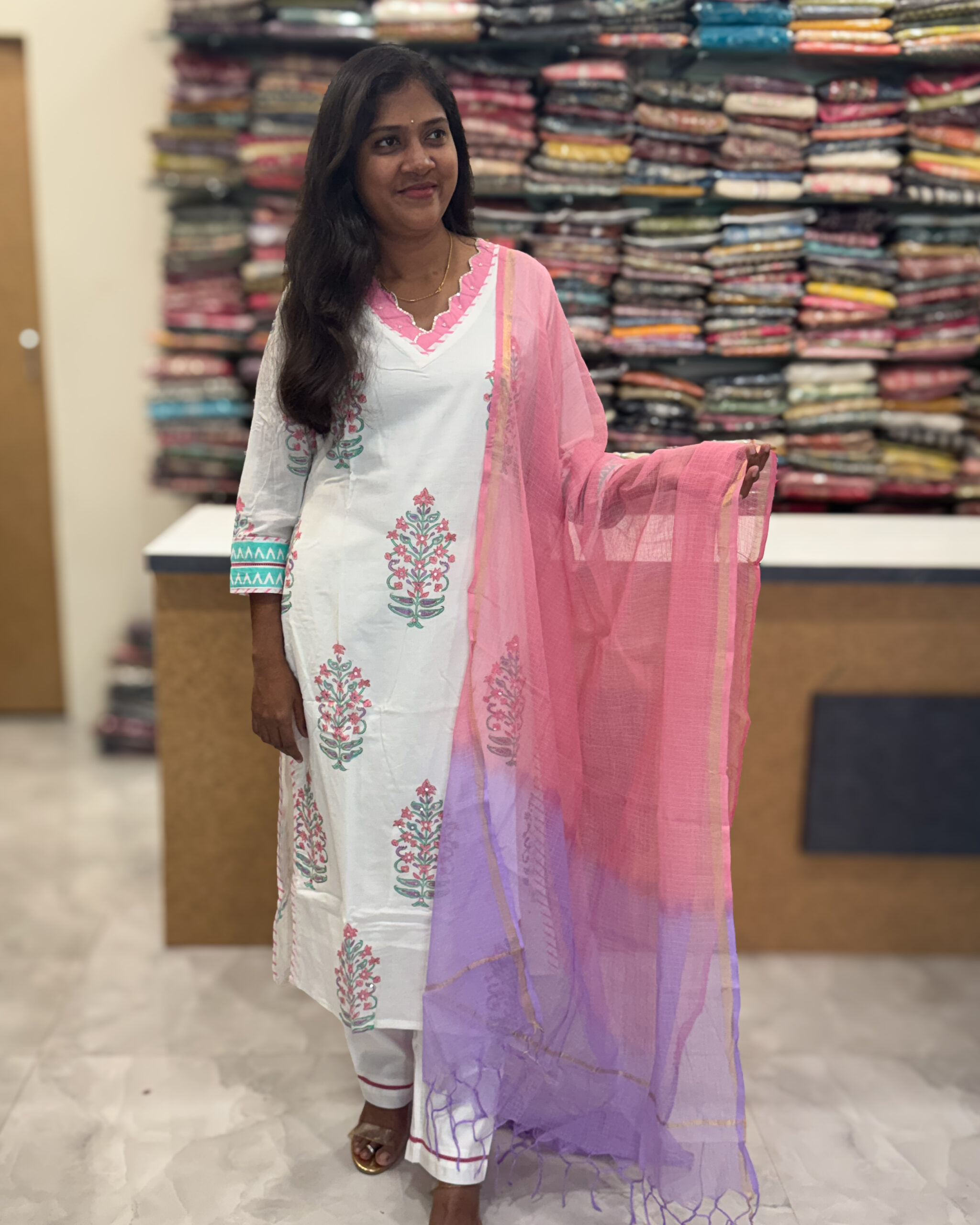 Elevate your style with this supreme-quality soft cotton ensemble, featuring a V-neckline, sequin-detailed prints, elastic pants, and a Kota dupatta for a professional yet elegant look.