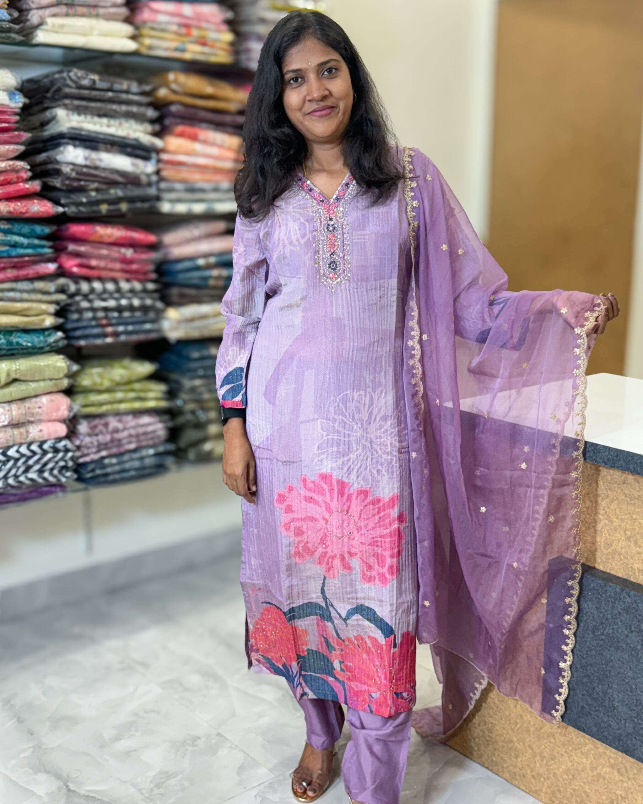 This beautiful Crushed Tissue Shimmer salwar suit features sequin detailing, an embroidered V-neck, an elasticated straight pant, and a delicate organza dupatta for a complete and elegant look.