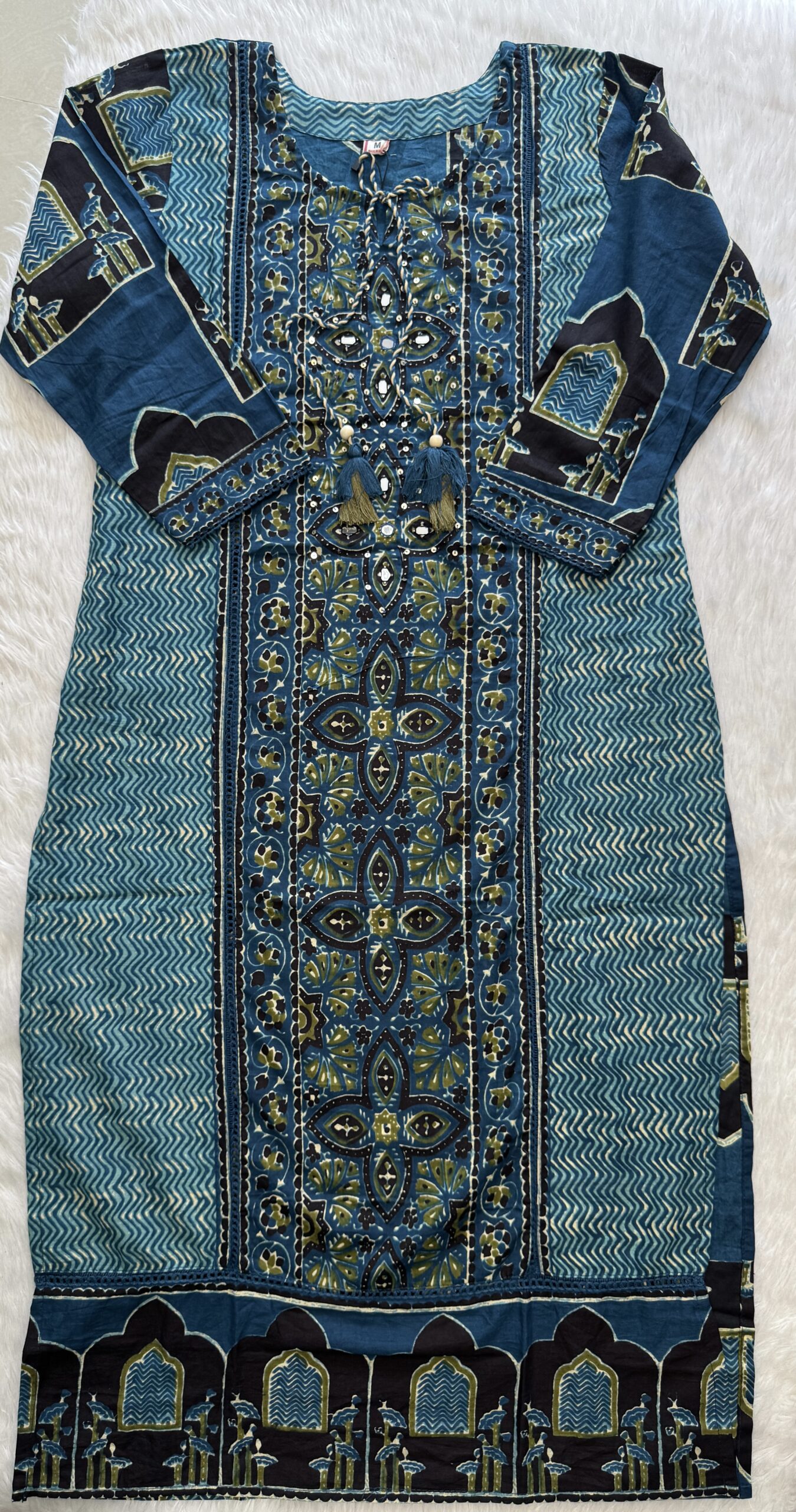 Improve your ethnic look with this beautiful cotton salwar suit. It has a keyhole neckline and a yoke decorated with sequins, embroidery, and mirror work. The lace-embroidered sleeves go well with elastic palazzo pants and a patterned dupatta that features tassel detailing.