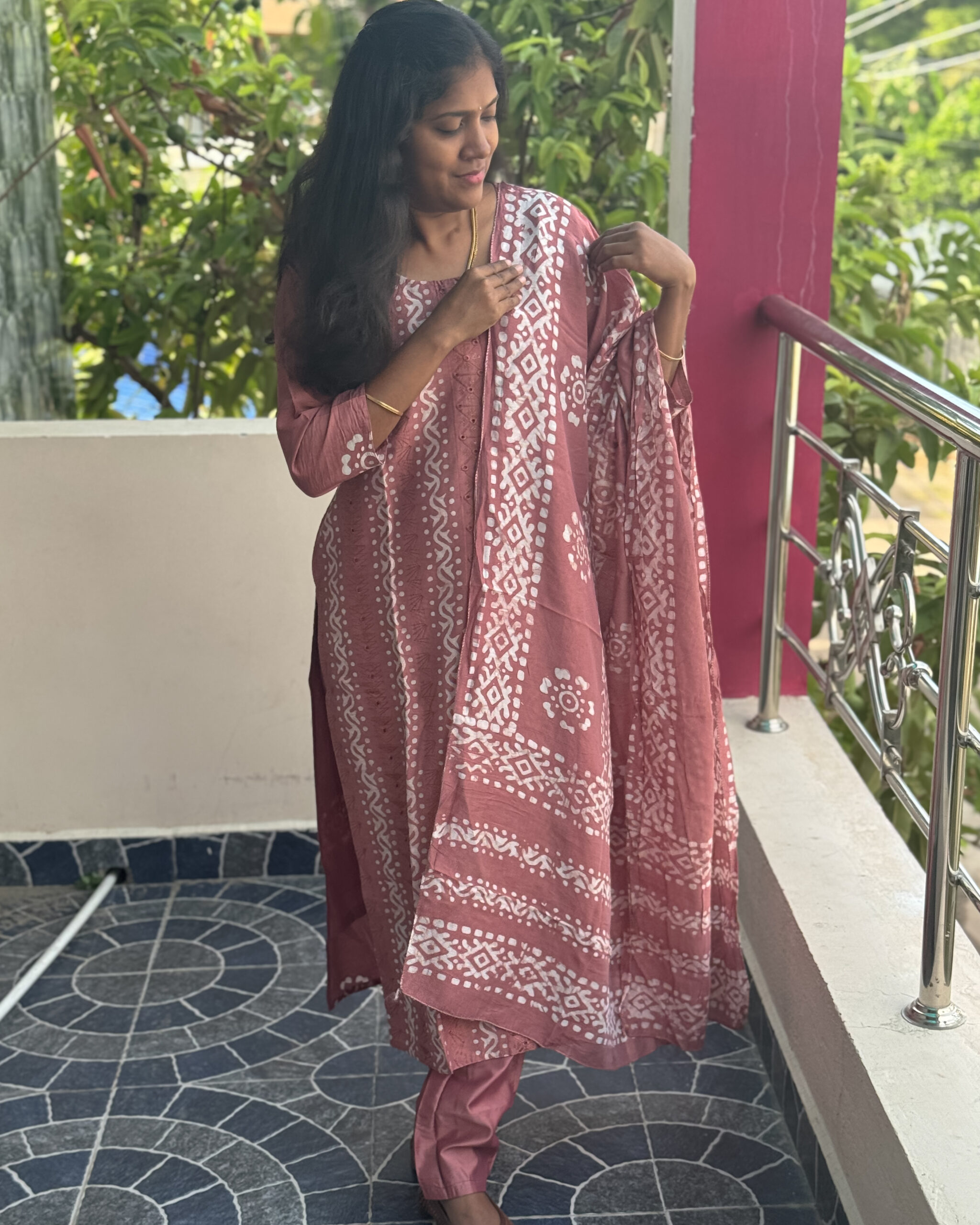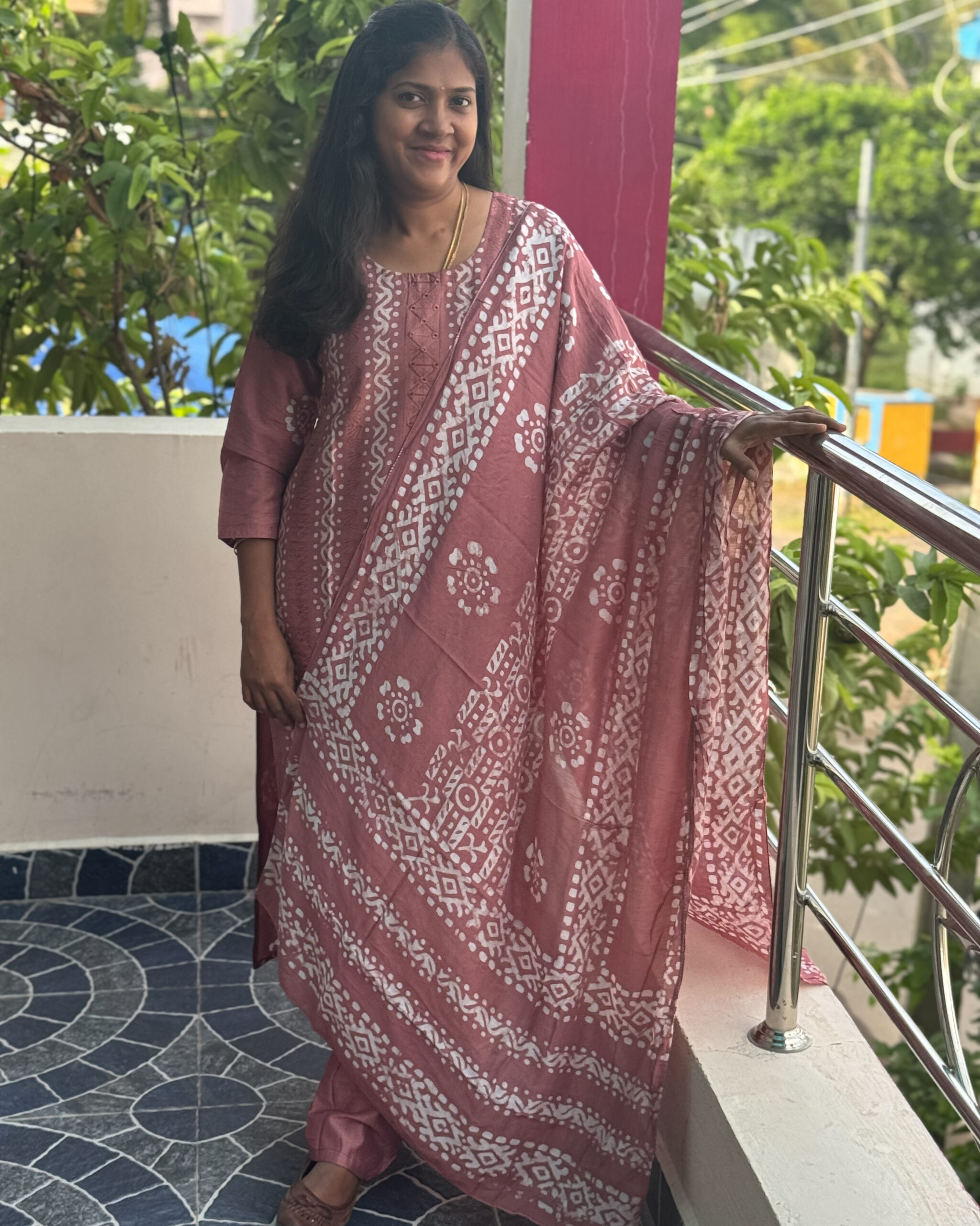 This modal silk salwar suit features hakoba motifs decorated with sequins on a round neck. It comes with a printed dupatta, elastic straight pants, and cotton lining for easy elegance.