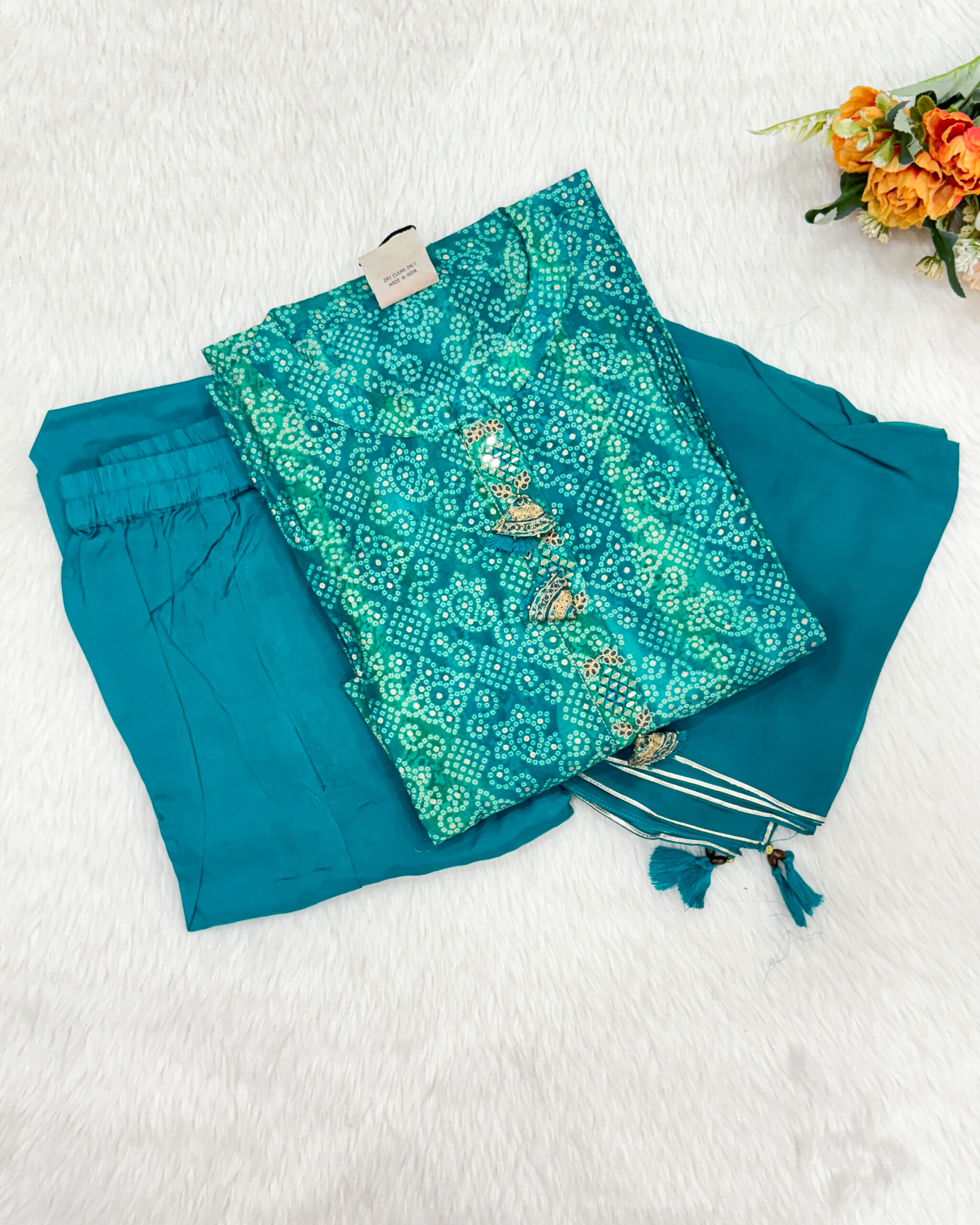 This beautiful muslin salwar suit has Bandhini printing. It features a collar neck decorated with mirror work, embroidery, and tassels on the yoke. The sleeves are embroidered, and it comes with standard elastic pants. The dupatta is adorned with lace work and tassels, creating a complete and elegant look.