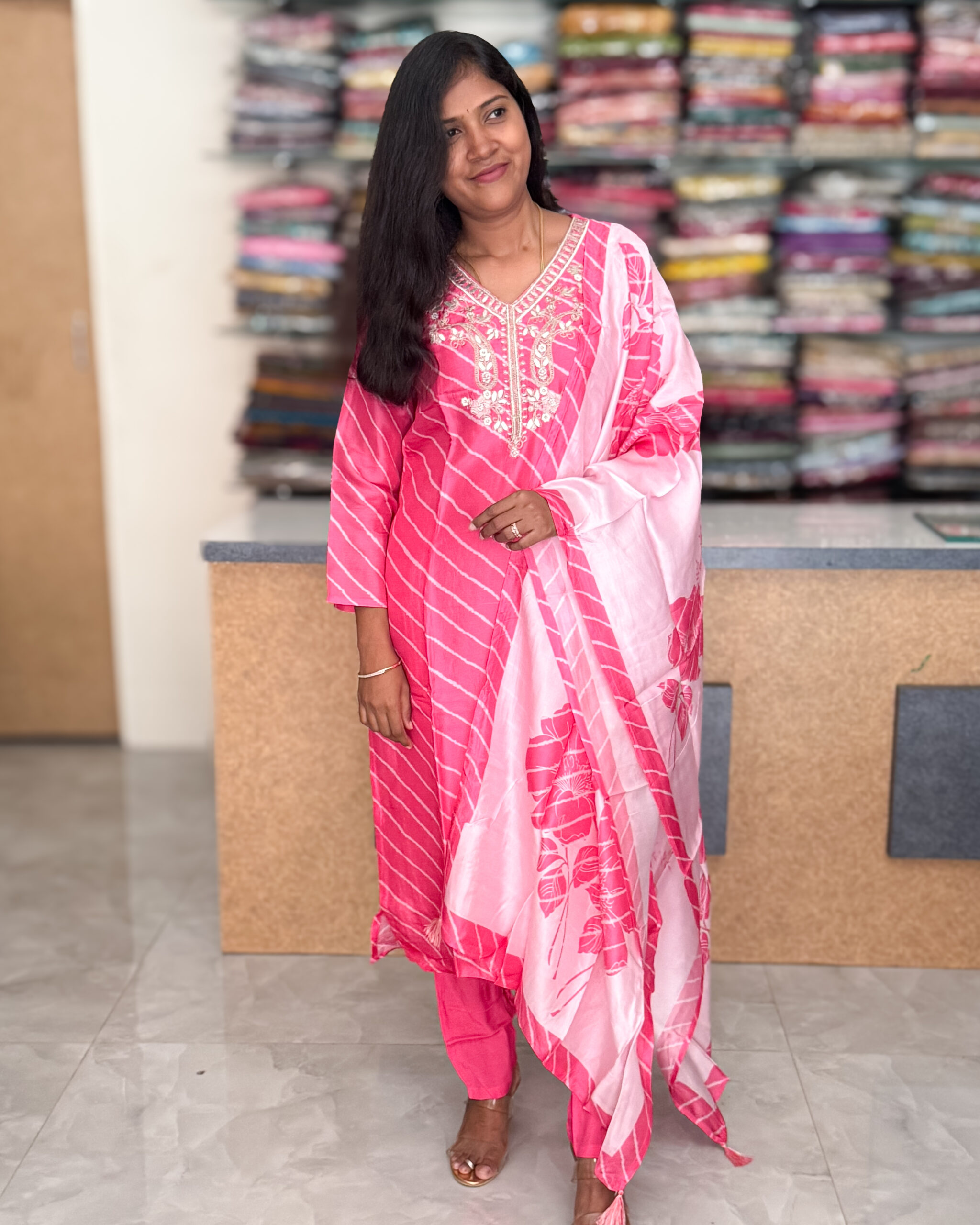 This muslin salwar set features pearl embellishments on the yoke, intricate kota patti detailing, a curved printed neckline, a cotton liner, elastic pants, and a floral-printed dupatta with tassel accents.