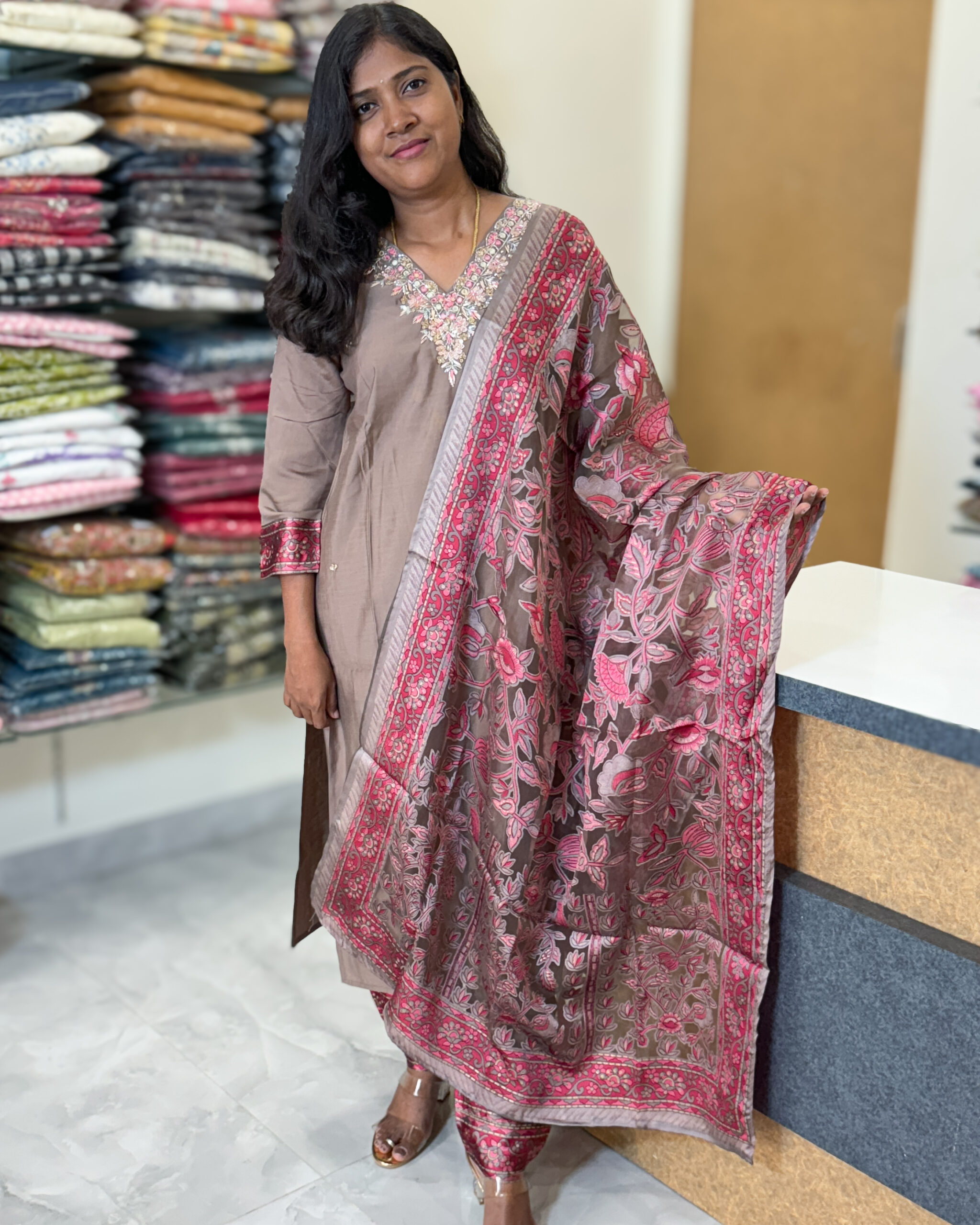 This gorgeous muslin salwar suit has embroidery V-neck and sequins as accents. Sleeves must have laces. This outfit is complete because it is matched with an organza dupatta and designer straight pants that are elasticated.