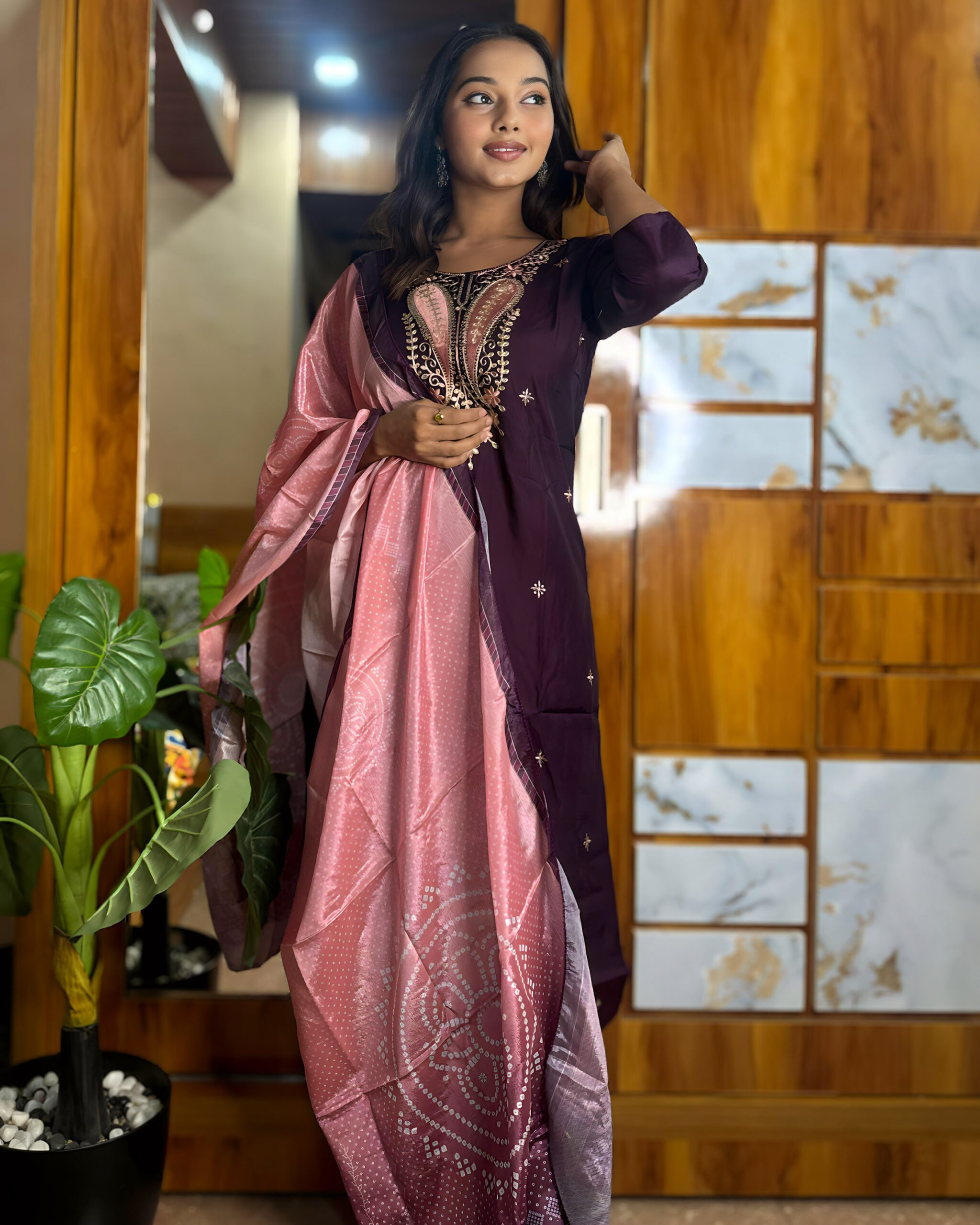 Muslin salwar set with embellished keyhole neck/yoke, lined construction, straight pants, and printed dupatta.