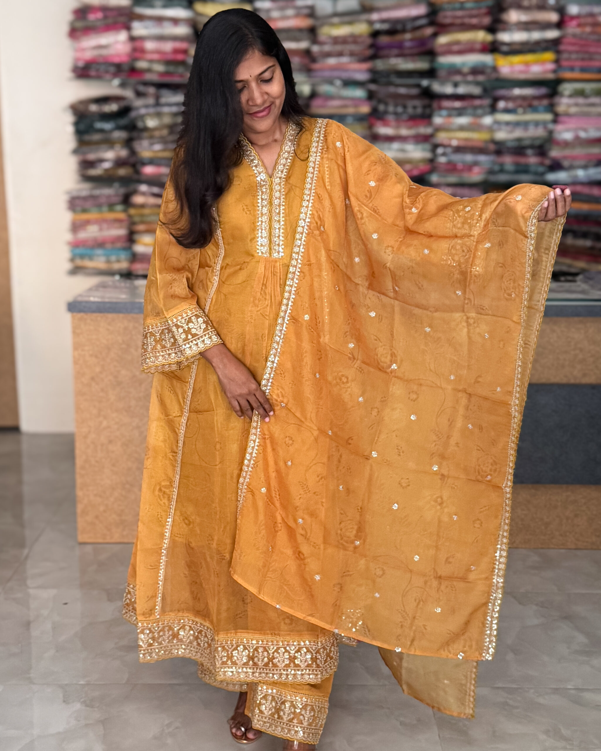 The ensemble includes elastic semi-palazzo pants that offer ease of movement while maintaining a modern silhouette. Completing the outfit is a delicately embellished organza dupatta that adds lightness, flow, and festive appeal. Whether styled for special occasions, family functions, or elegant gatherings, this salwar set blends traditional craftsmanship with contemporary comfort, ensuring you look graceful and confident wherever you go.