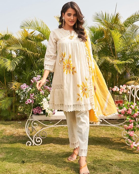 A stunning pure cotton salwar set with a lined cotton bottom, a colorful leheriya dupatta, and hand-painted floral patterns, sequin accents, and lace detailing with lining.