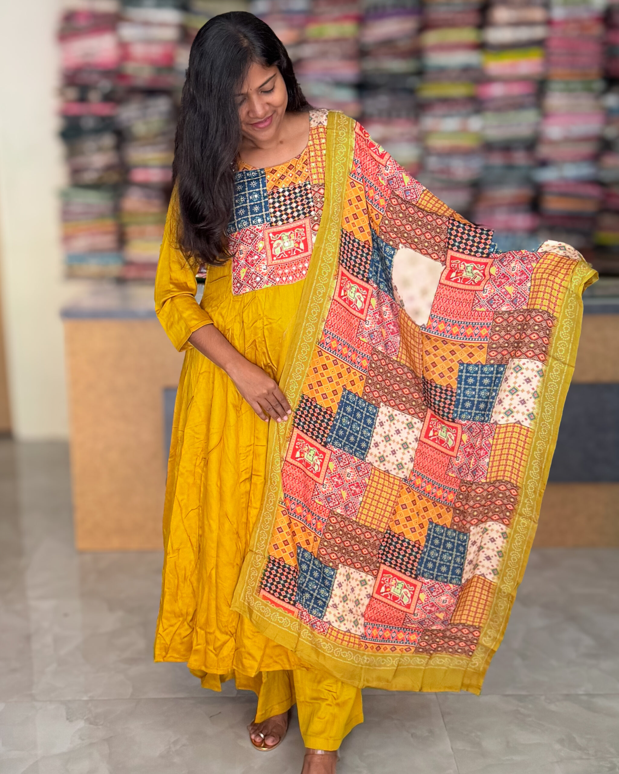 Stylish semi-gaji silk umbrella salwar suit with a round neck, detailed yoke embroidery, mirror work, and sequin accents. It comes with an eye-catching printed dupatta and comfortable elasticated palazzo pants.