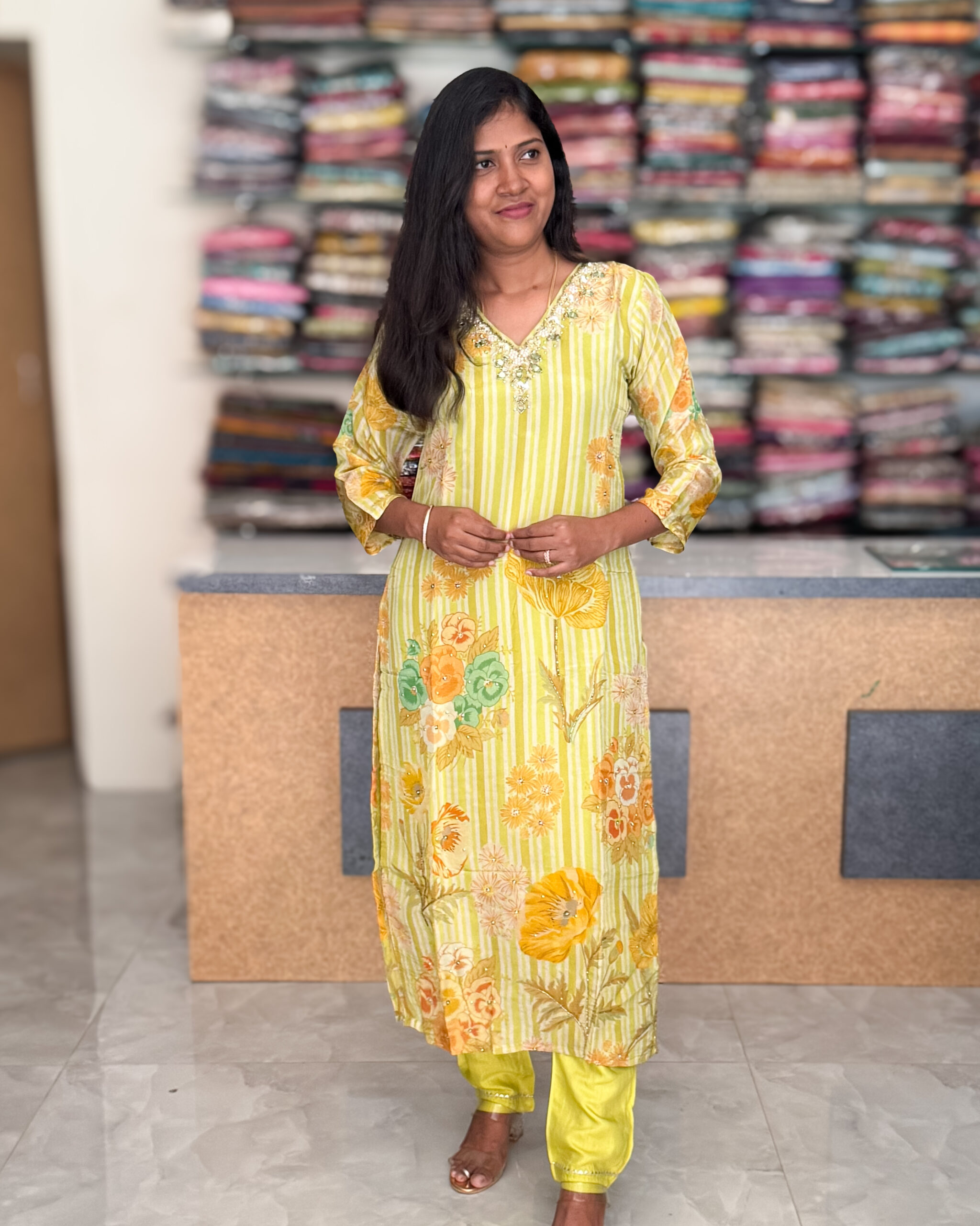 This beautifully made salwar set features a V-neckline adorned with pearls, intricate embroidery, mirror work, and sequin details. It also includes delicate pearl and floral designs. The set comes with stylish elastic pants and a dupatta that has floral embroidery and sequin accents, creating a stunning, complete outfit.