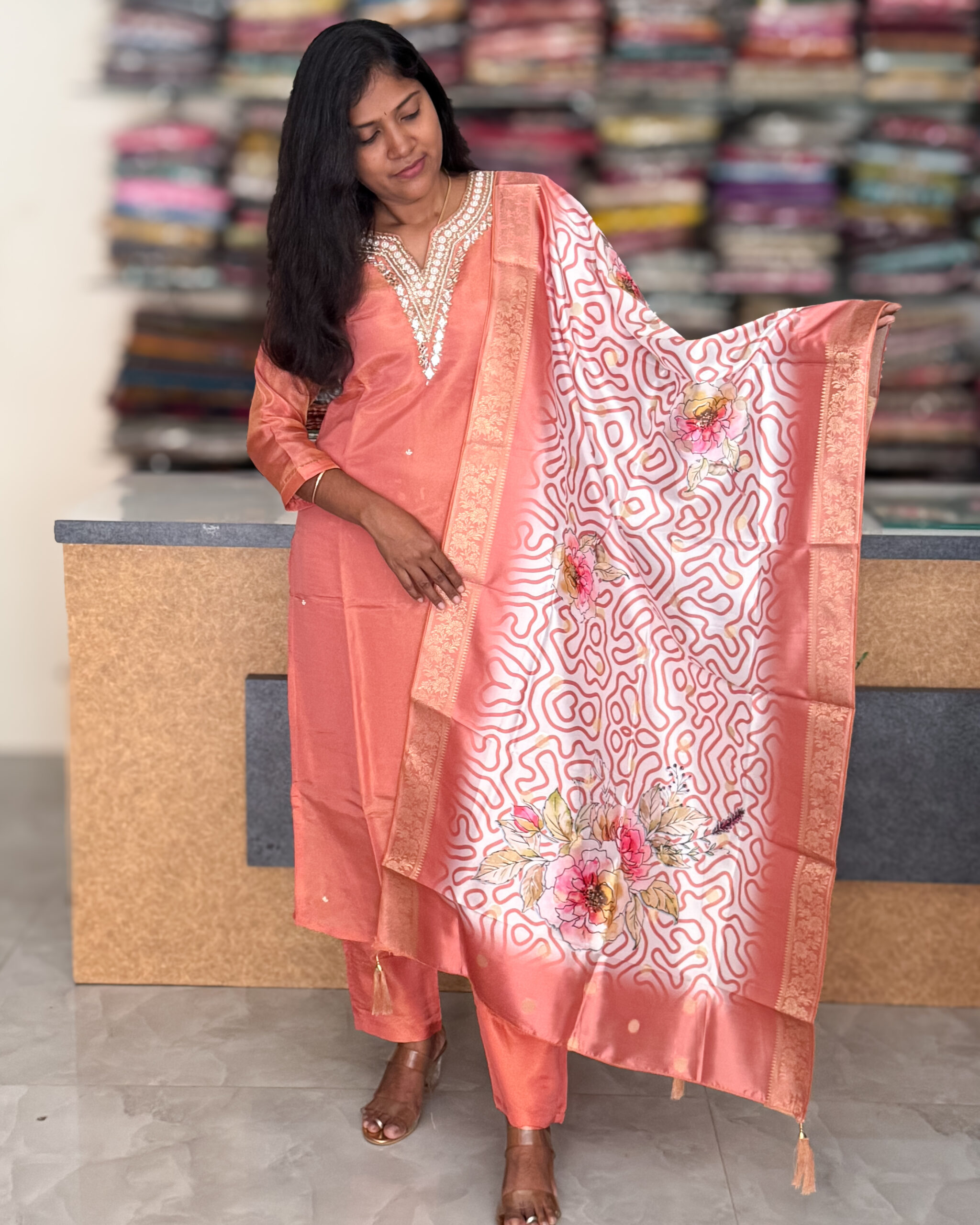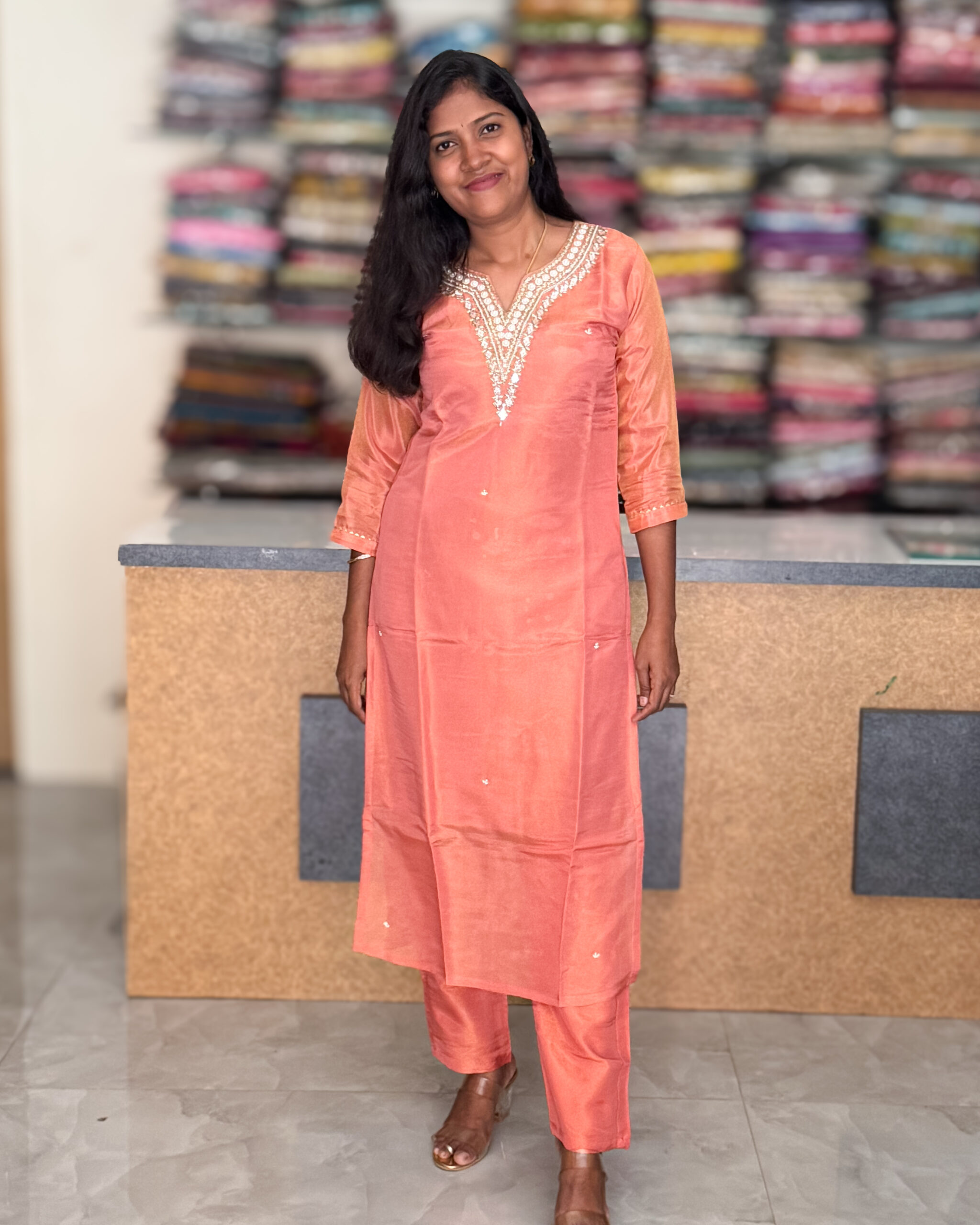 This beautiful salwar suit has a Round with V-neck that is carefully decorated with embroidery, pearls, and sequins. The sleeves are covered in sparkling sequins and pearl designs. It comes with high-quality lining, stylish straight pants, and a dupatta that showcases detailed sequin work, pearl details, and embroidery, creating a luxurious outfit.