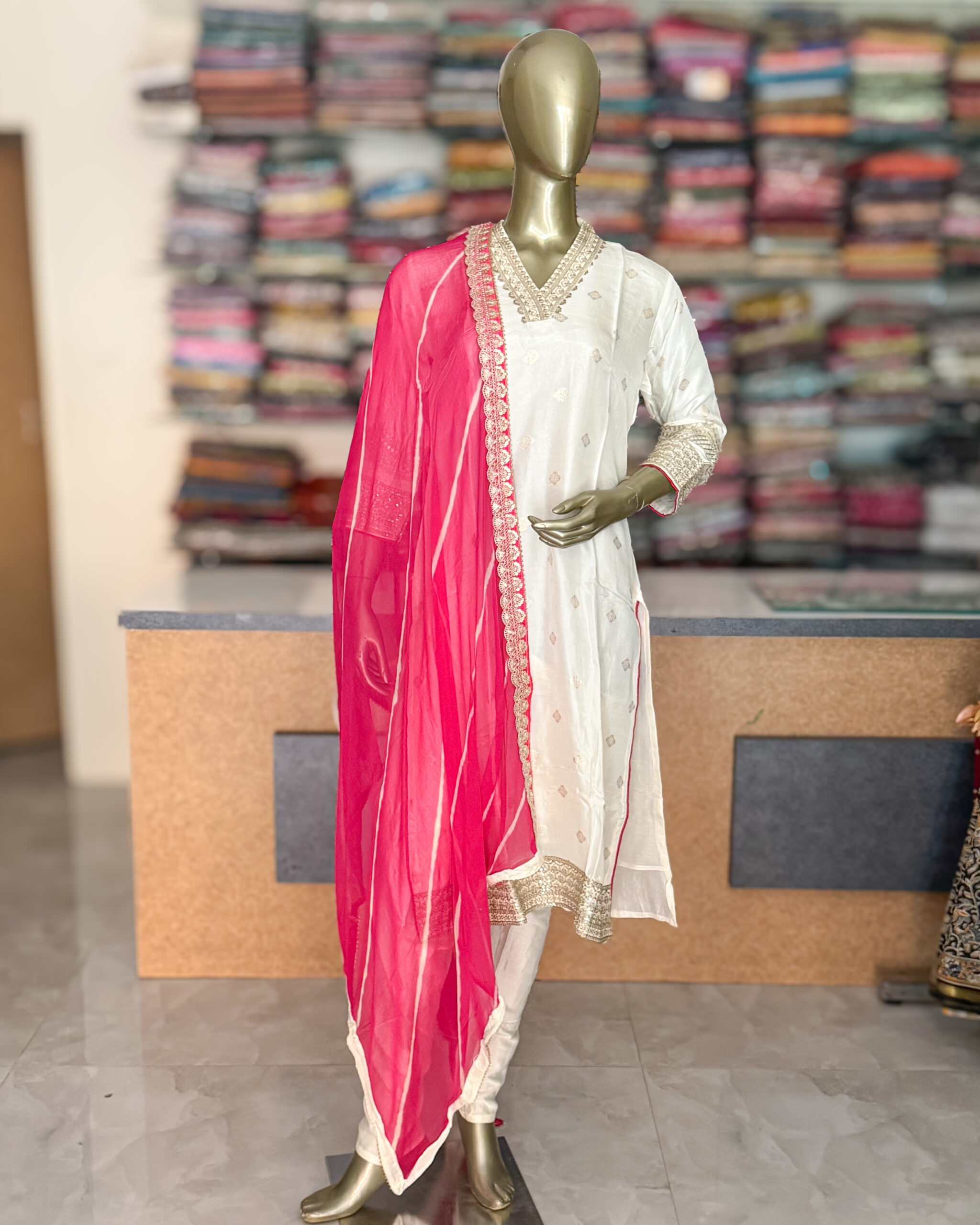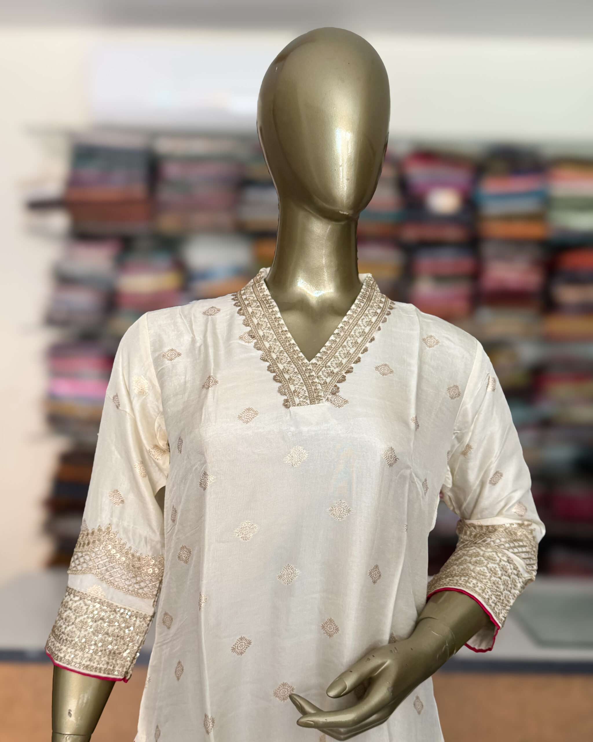 Elegant gentle glow silk  salwar set with collared V-neck, sequin detailing, jacquard sleeves, cotton lining, elastic pants, and chiffon lace dupatta.