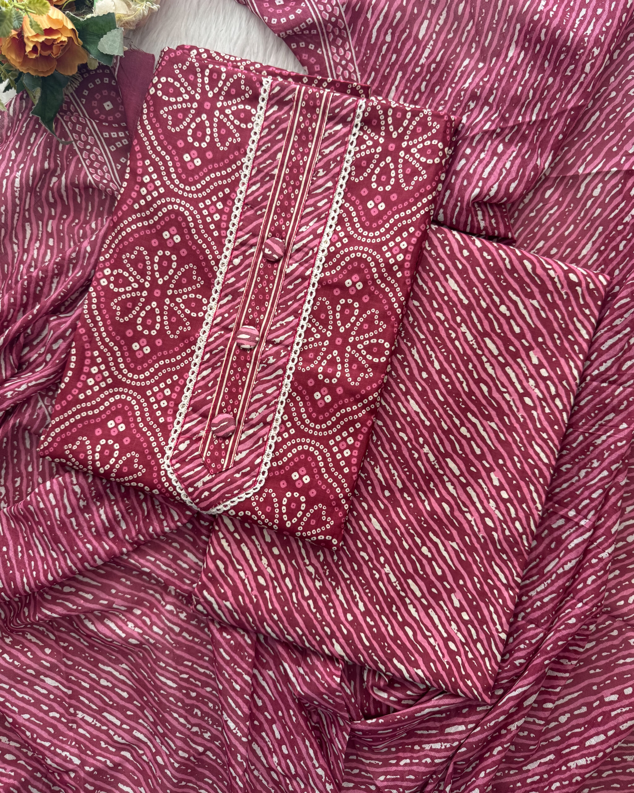 Shop cotton salwar set material with buttons and laces in the yoke pattern, printed pant and cotton dupatta. Perfect for office and casual wear