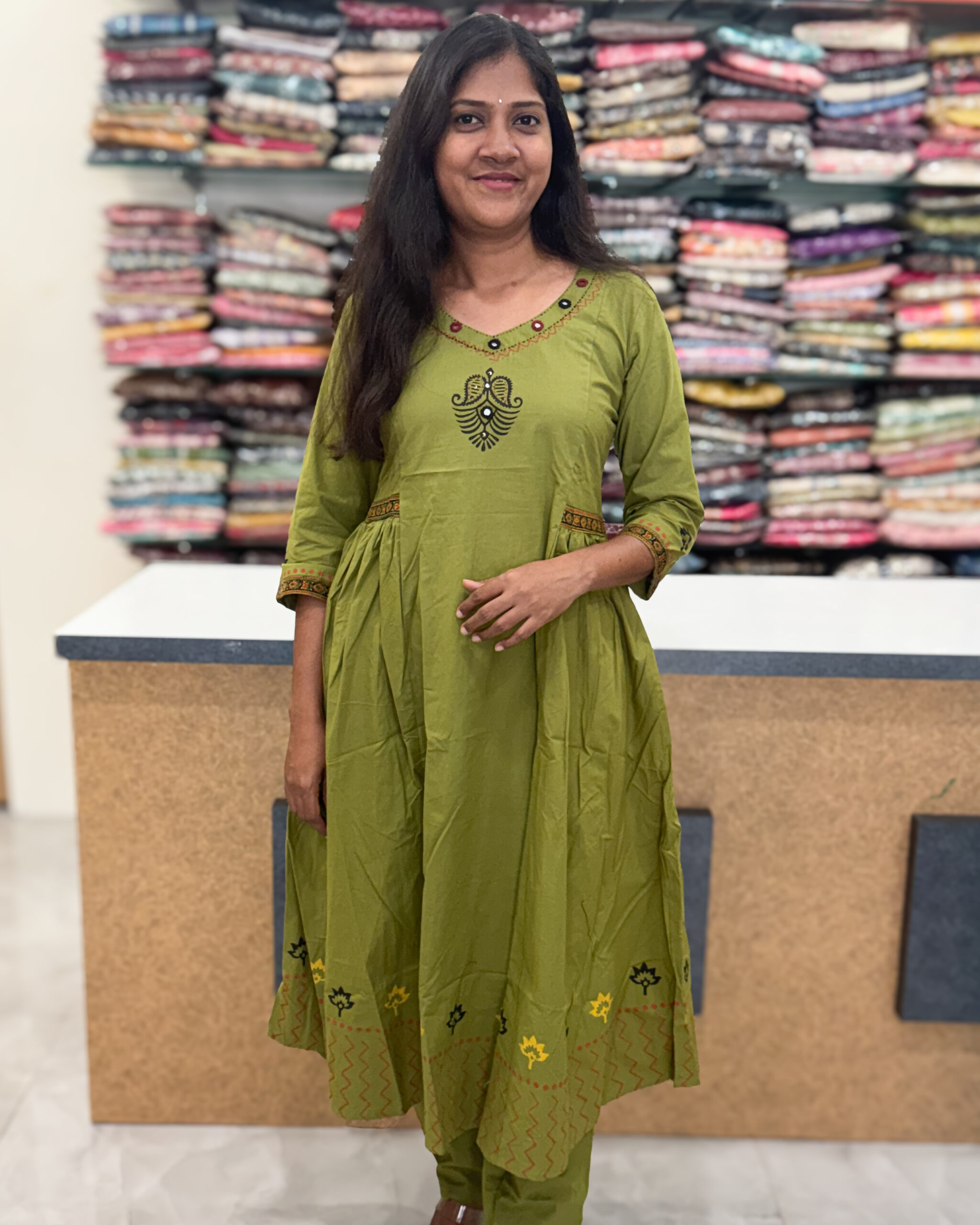 This dark green cotton salwar suit has a regular and comfortable fit. It features elastic-waist pants for flexibility and easy movement. The fit is suitable for everyday comfort and long wear.