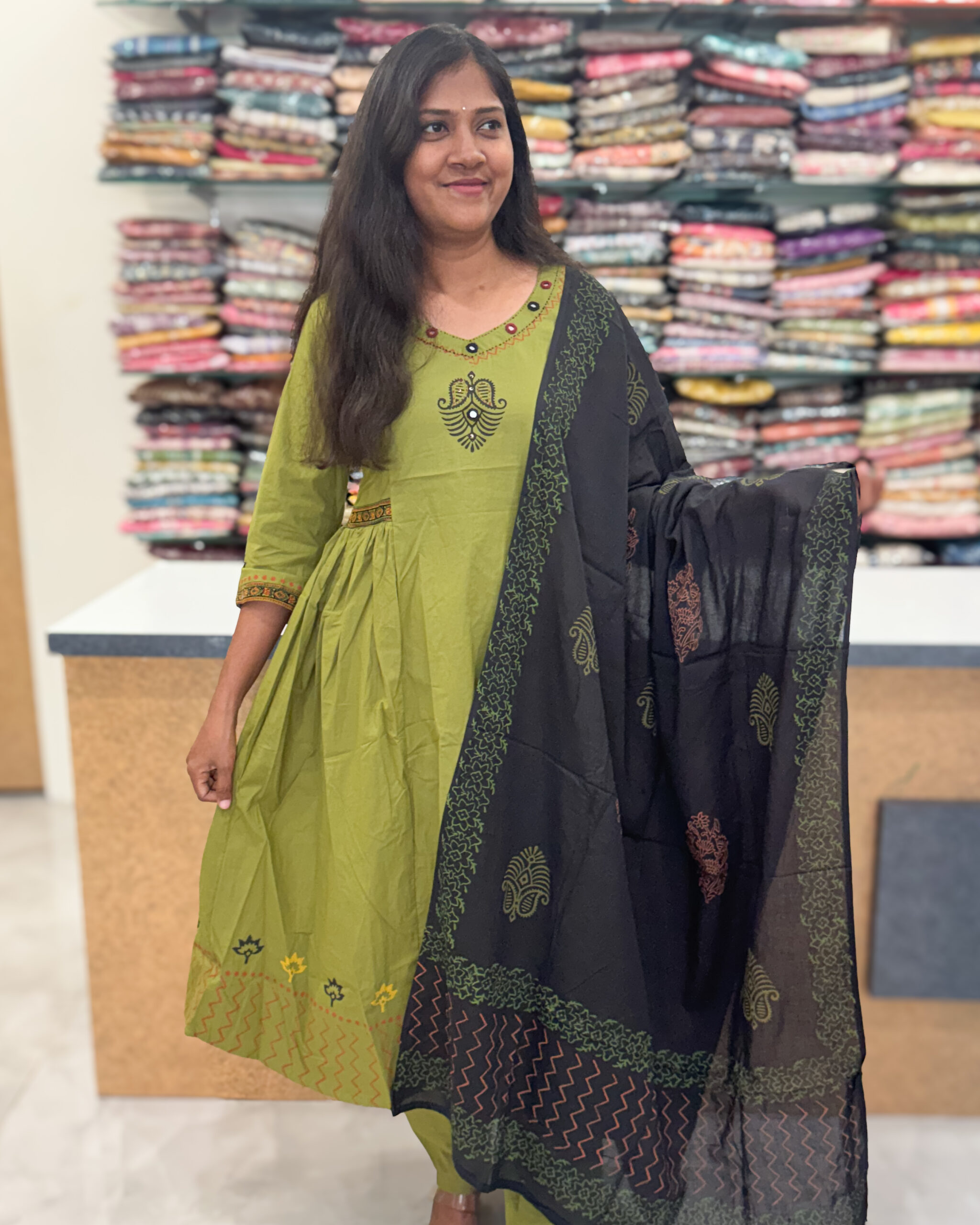 Completing the ensemble is a matching printed dupatta that adds balance and charm. Perfect for office wear, family gatherings, festive occasions, and casual outings, this umbrella salwar suit blends traditional detailing with modern comfort effortlessly.