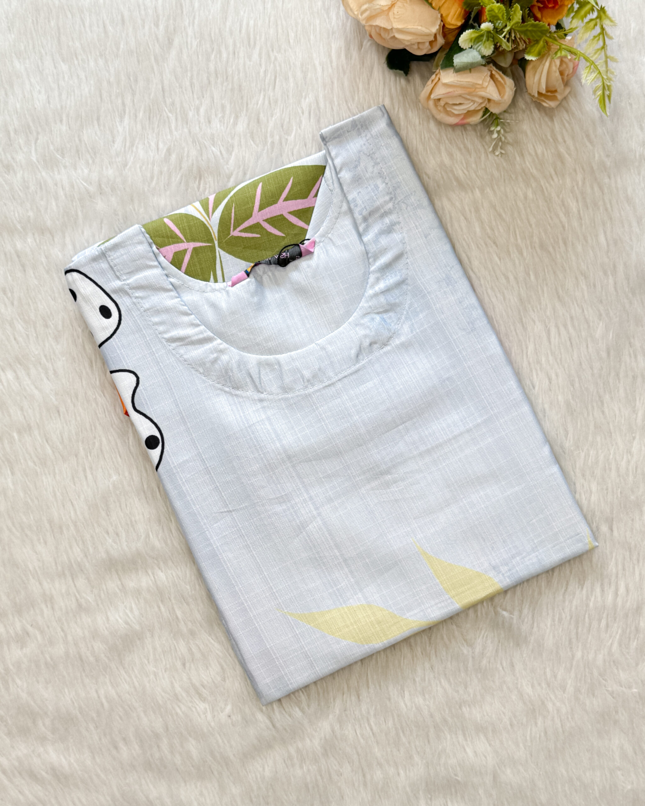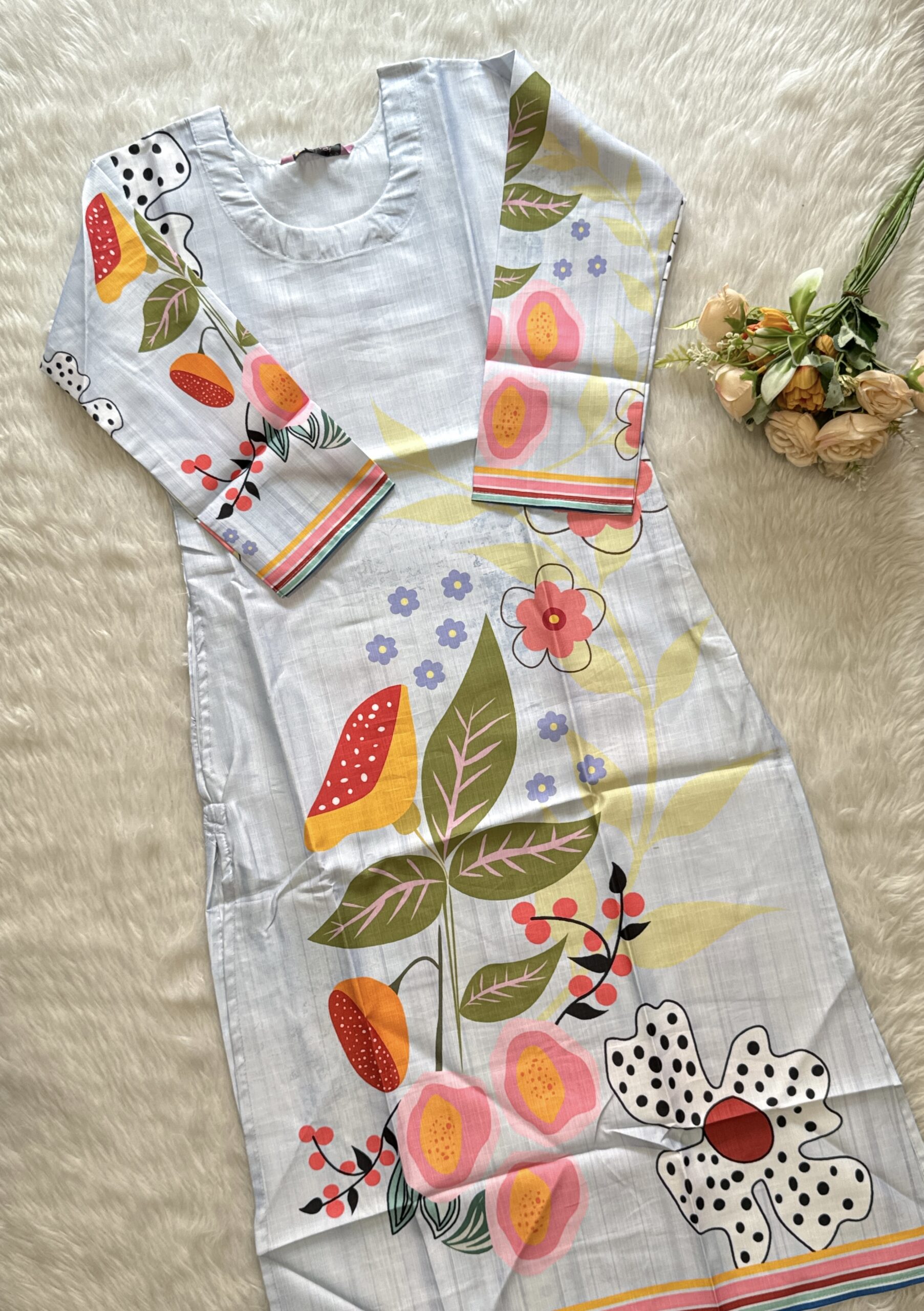 The lovely kurti made of vatican silk with a round collar. A lovely printed design is included. It is appropriate for everyday use and workplace use.