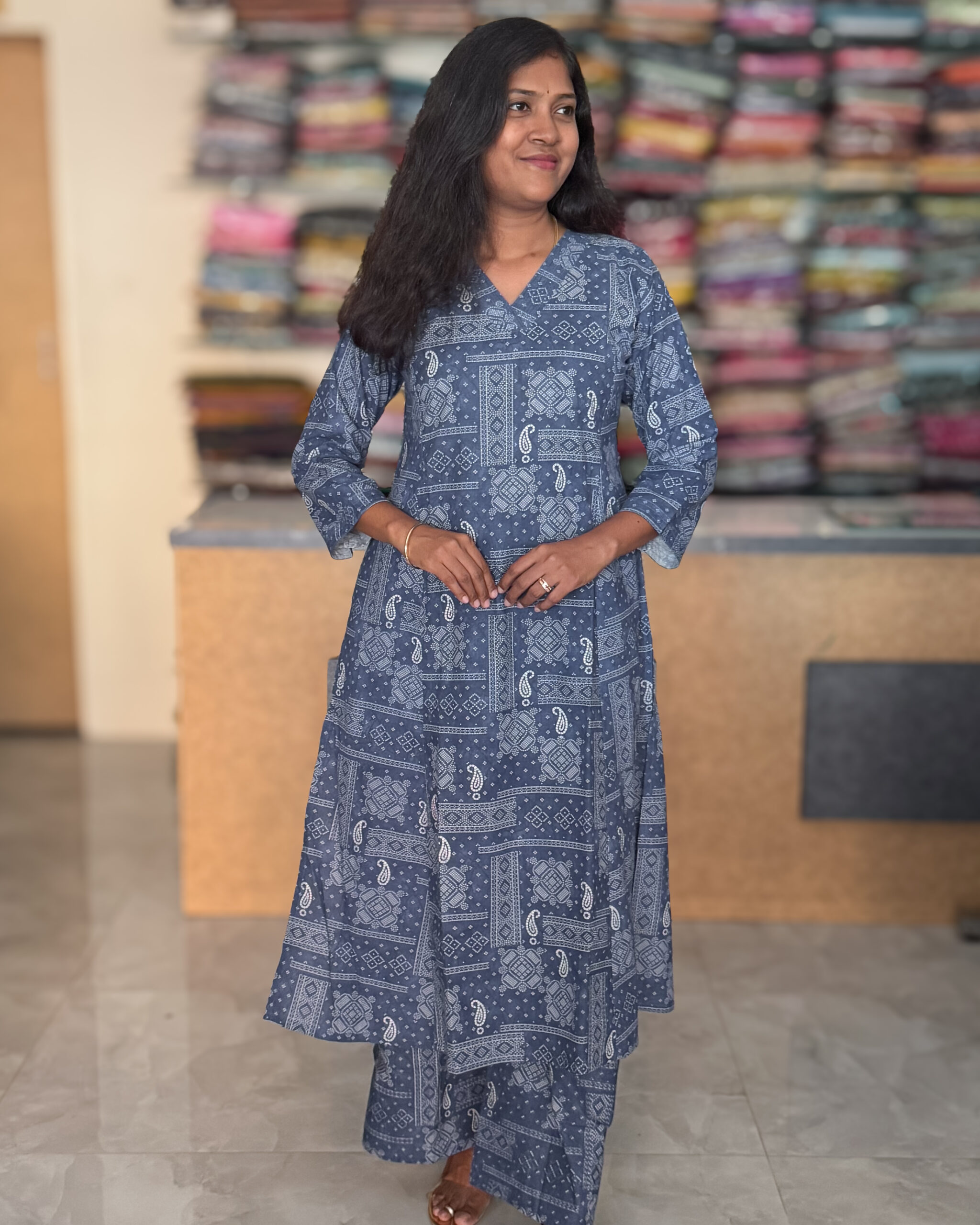 This gorgeous A-line khadi cotton co-ord set features a V-neck and a printed pattern. There are pockets on the top and bottom of it. It consists of a type of knotted elastic palazzo pant.