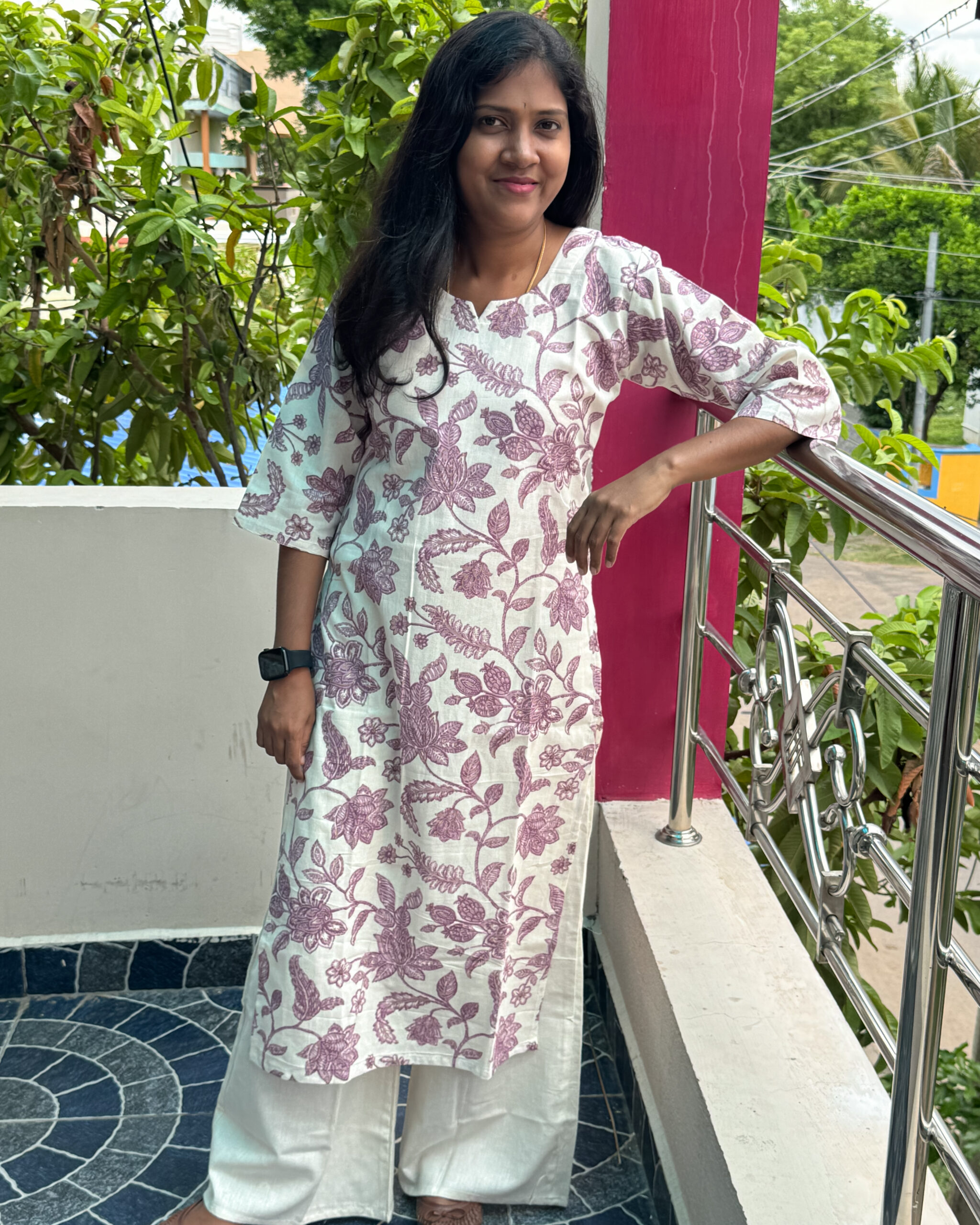 These gorgeous round-necked cotton kurta pants with a keyhole design and a useful button are printed with flowers. Elastic palazzo pants to be provided.