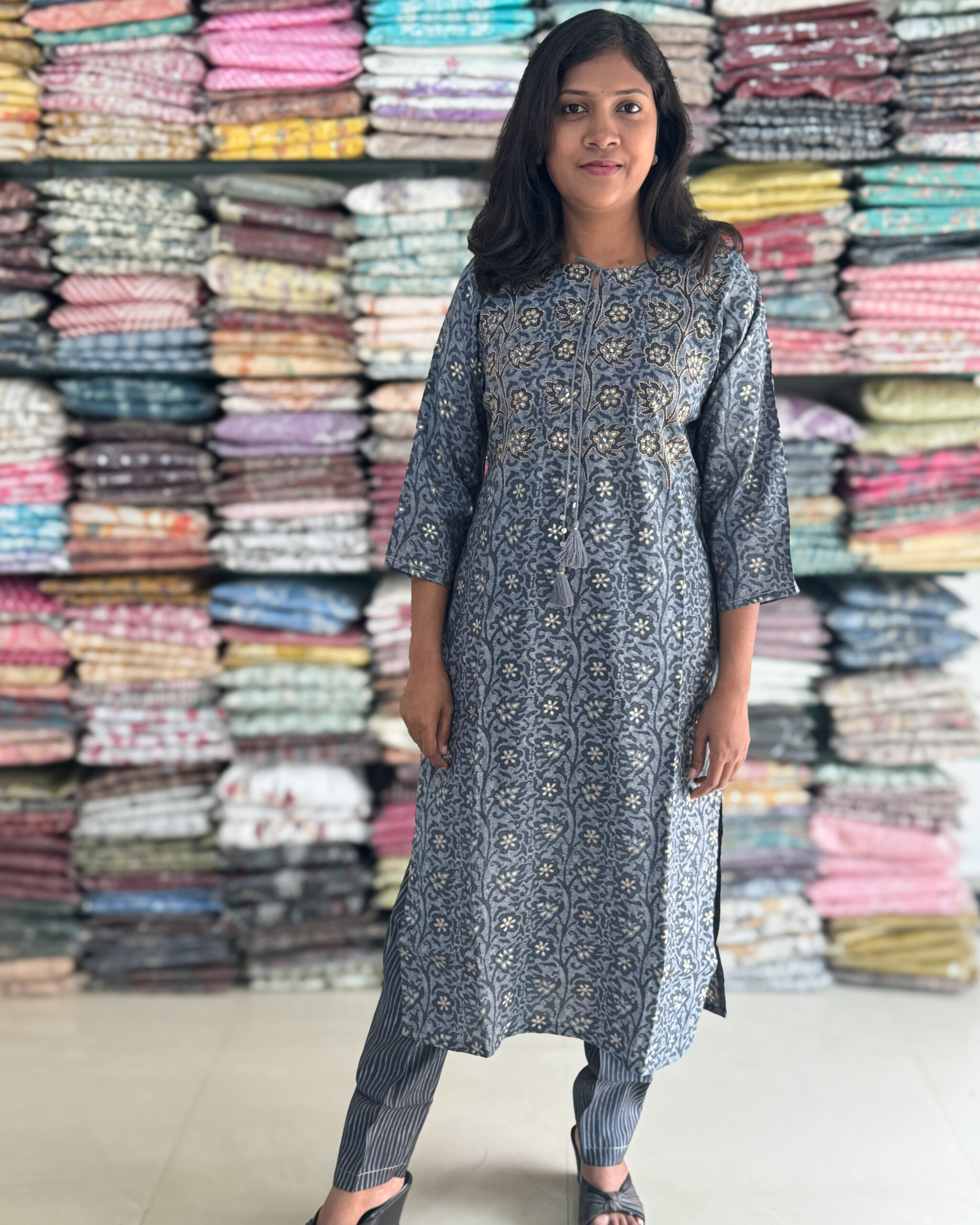 This exquisite muslin printed kurta highlighted with embroidery and mirror works detailing in the yoke pattern. it has a standard elastic comfortable bottom.