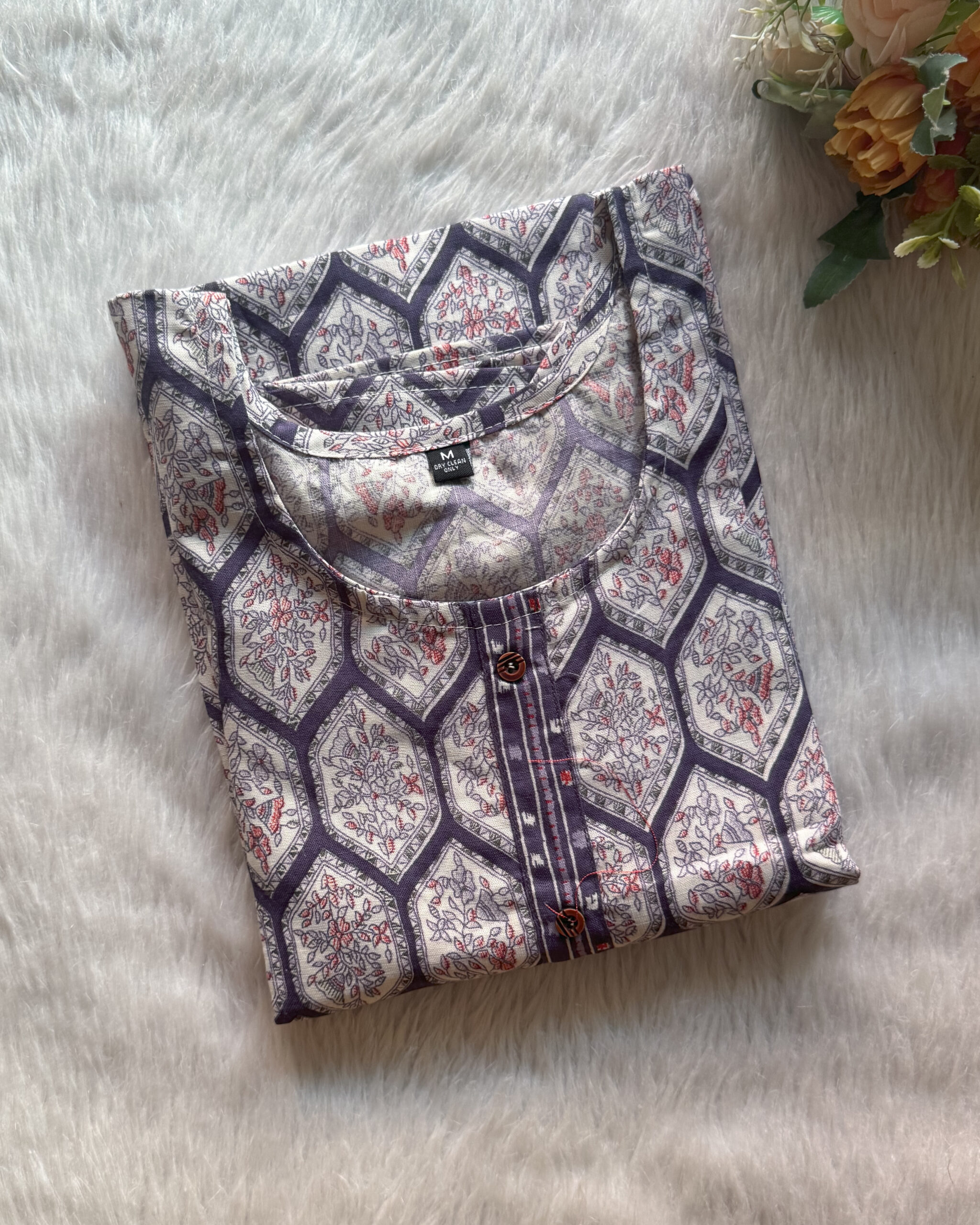 This cotton kurti features lovely floral motifs and elaborate buttons in the yoke pattern. It has a round collar. It’s perfect for daily use.