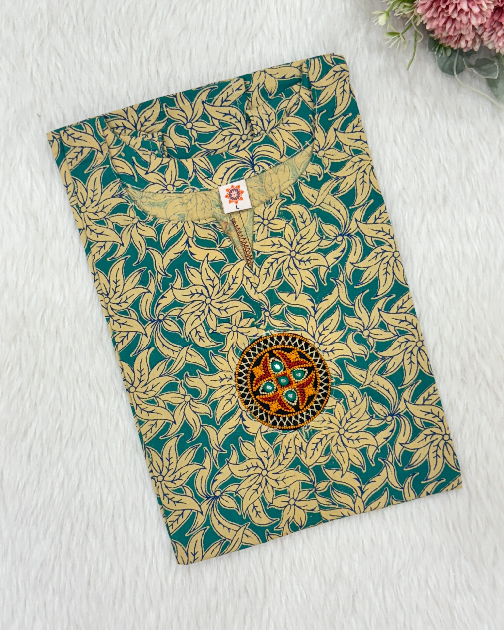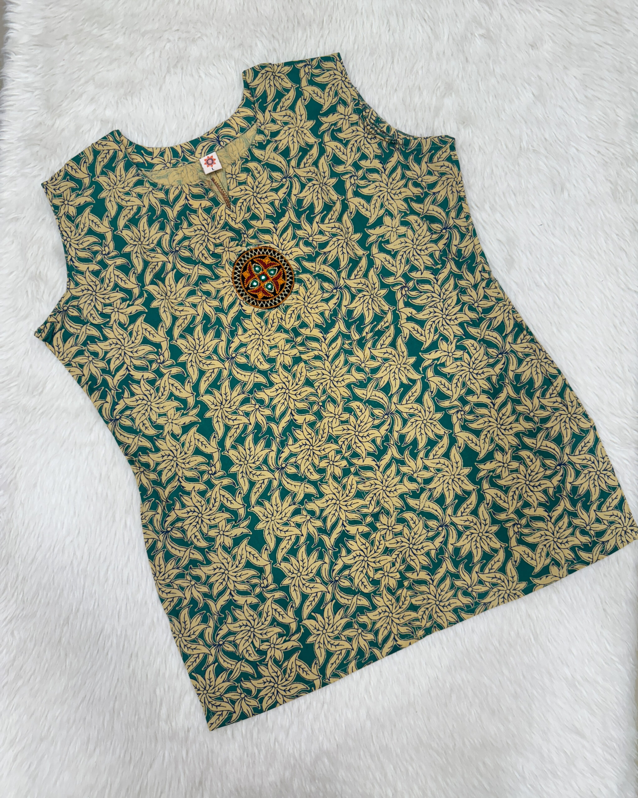 The cotton patterned tunic features a keyhole neck and a yoke embellished with sequin embroidery. comes with a side slit.