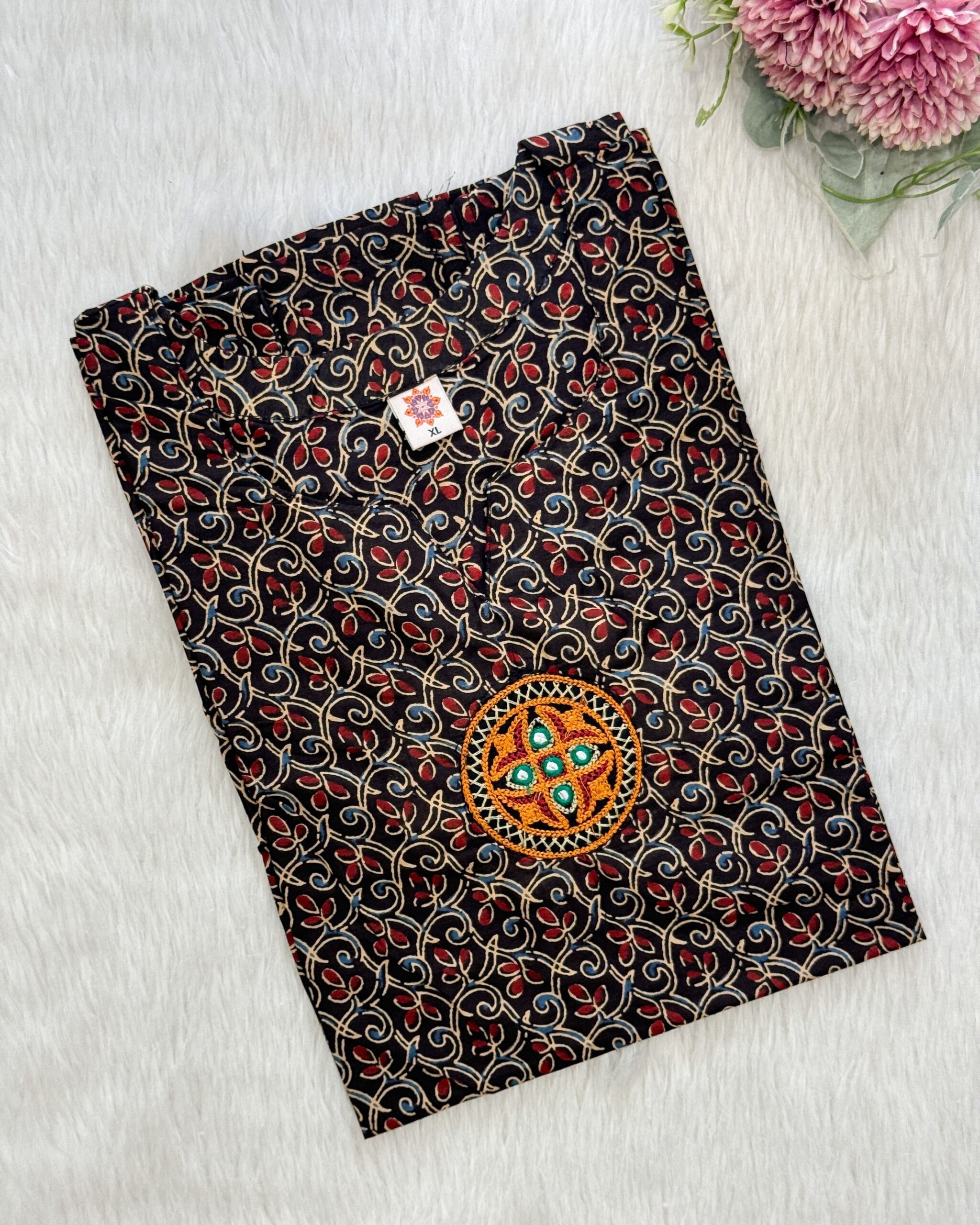 The cotton patterned tunic features a keyhole neck and a yoke embellished with sequin embroidery. comes with a side slit.