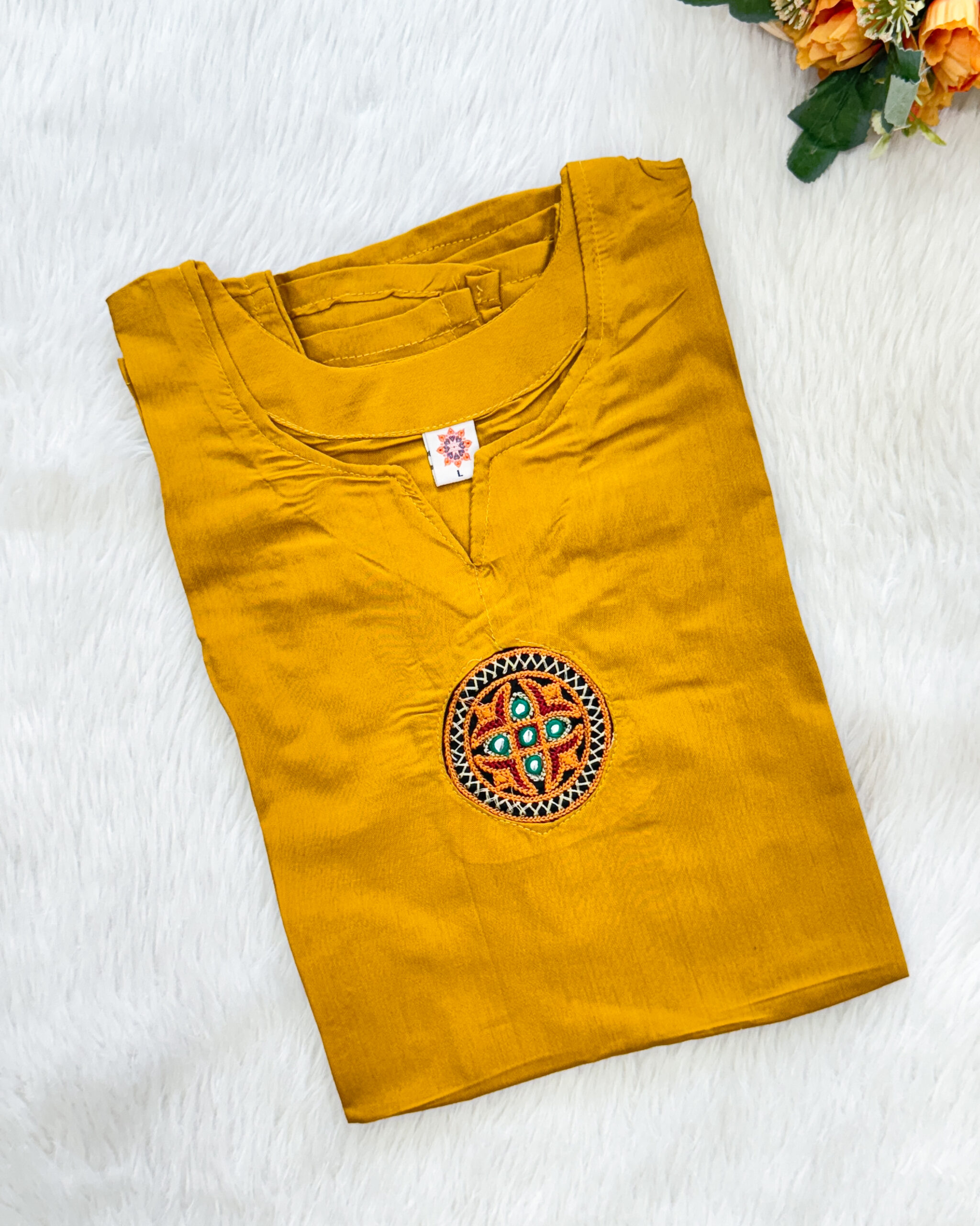 The silk tunic features a keyhole neck and a yoke embellished with sequin embroidery. comes with a side slit.